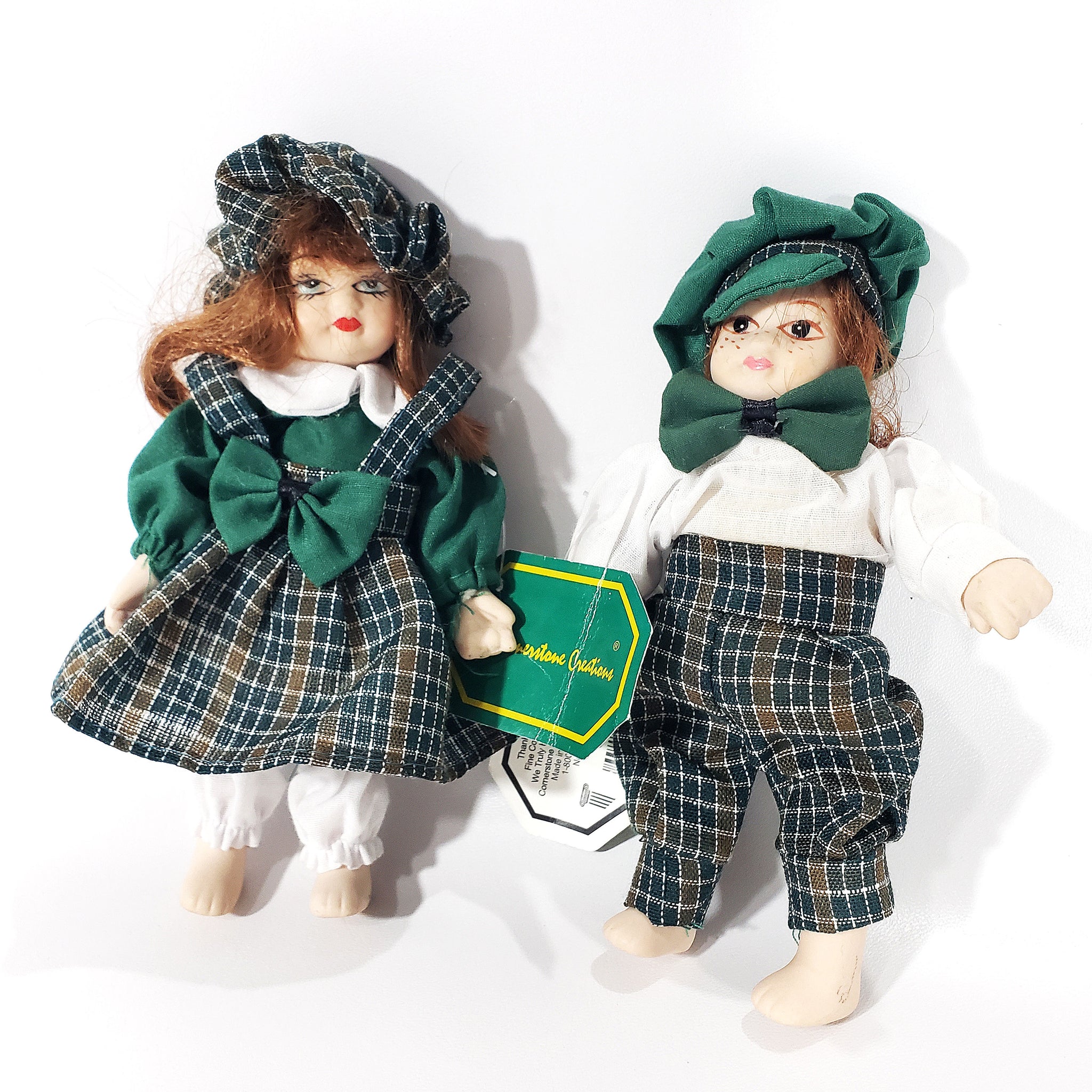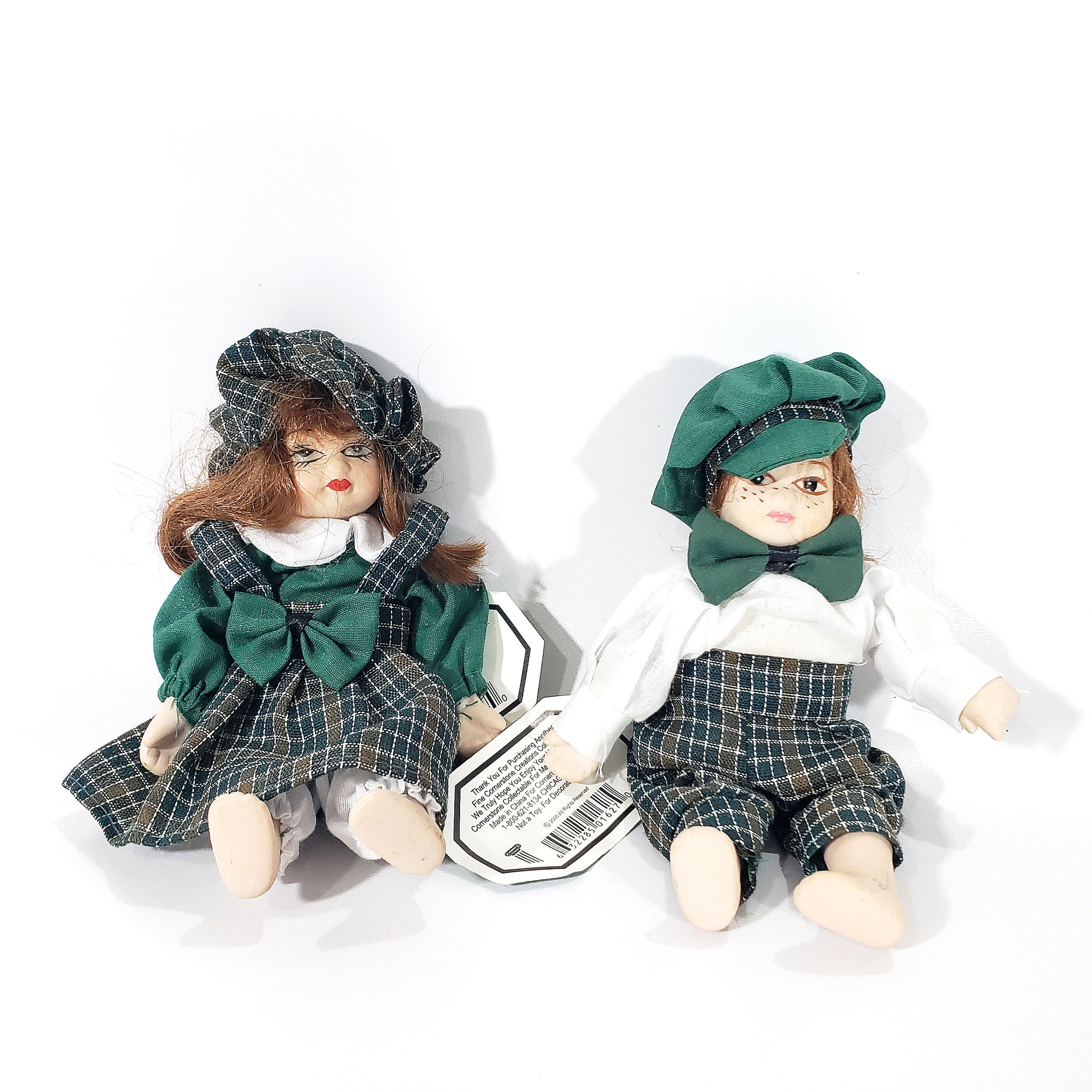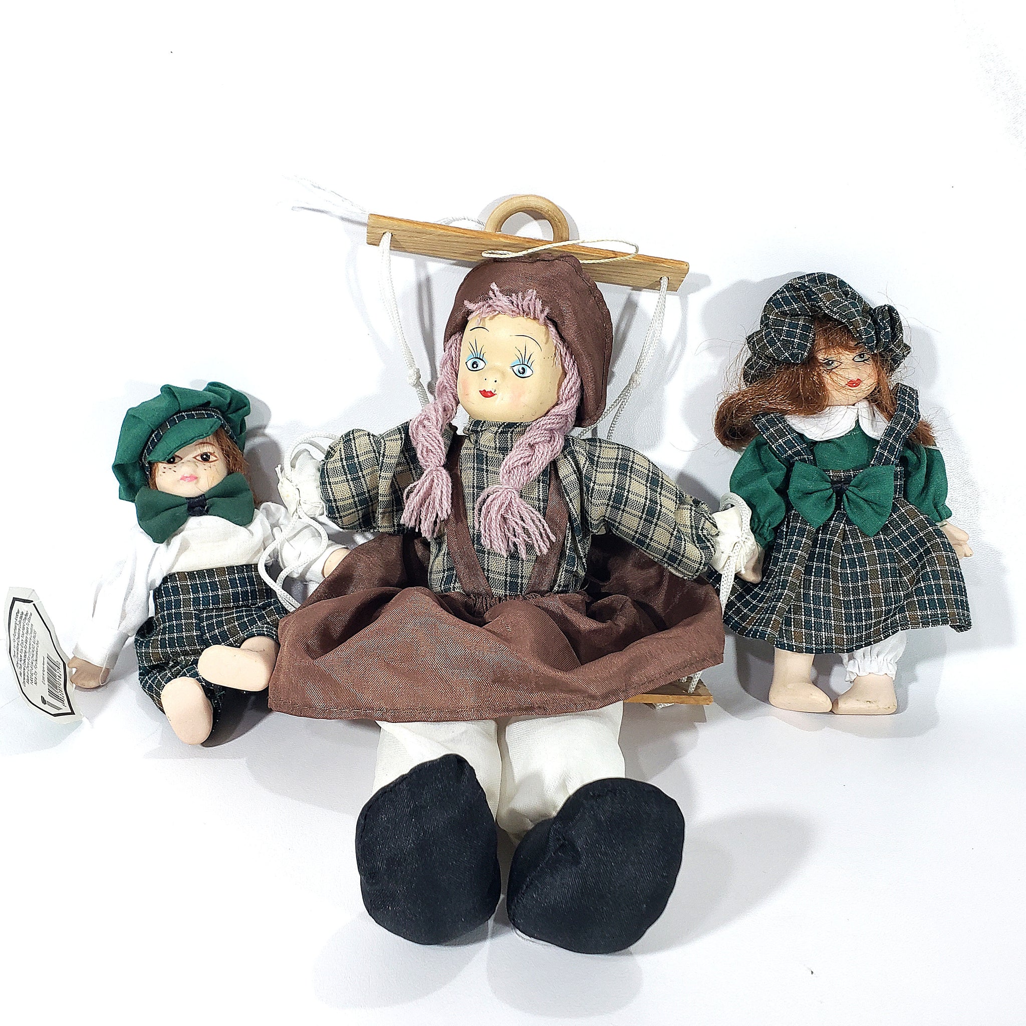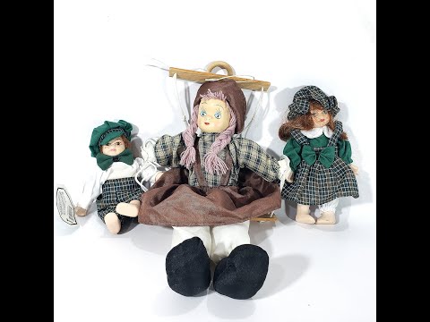 Juego de tres piezas de muñecos de porcelana y trapo. Dos de las piezas son pequeñas y las extremidades al interior son de alambrón, por lo cual se pueden modificar de posición, pueden colocarse con los pies extendidos, doblados, igual con los brazos.