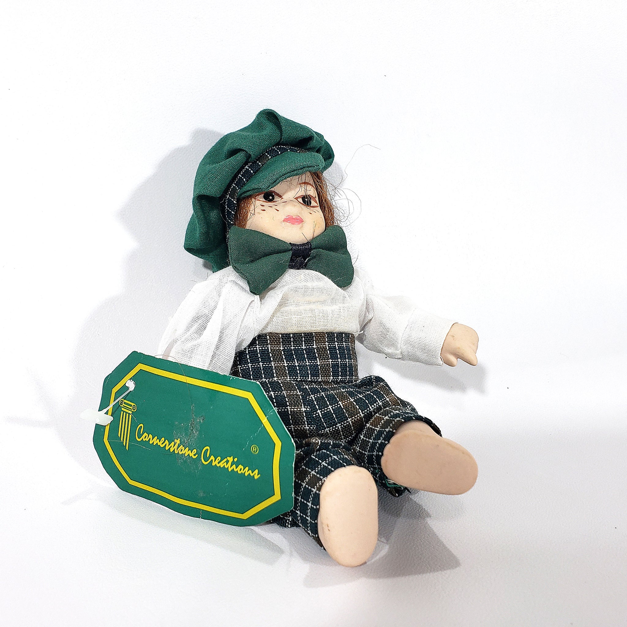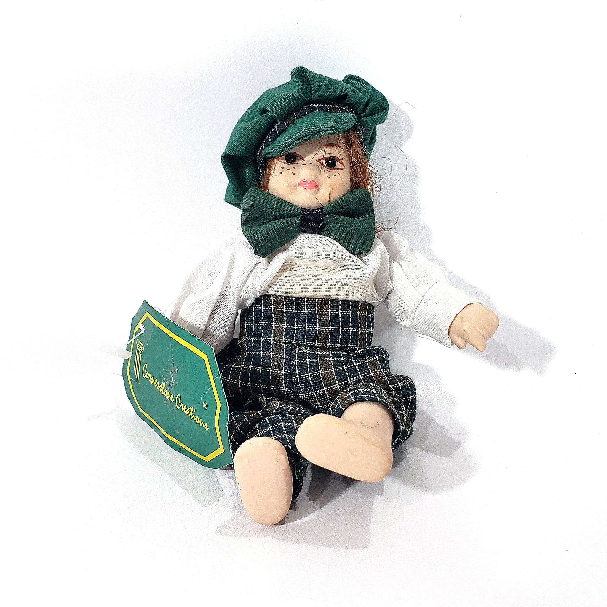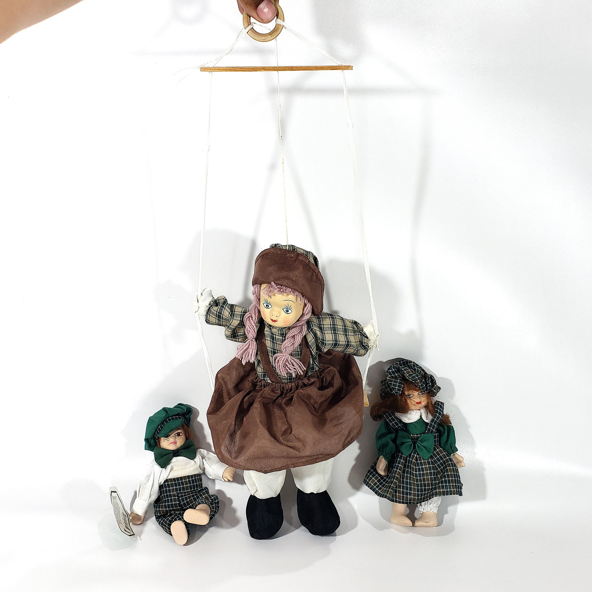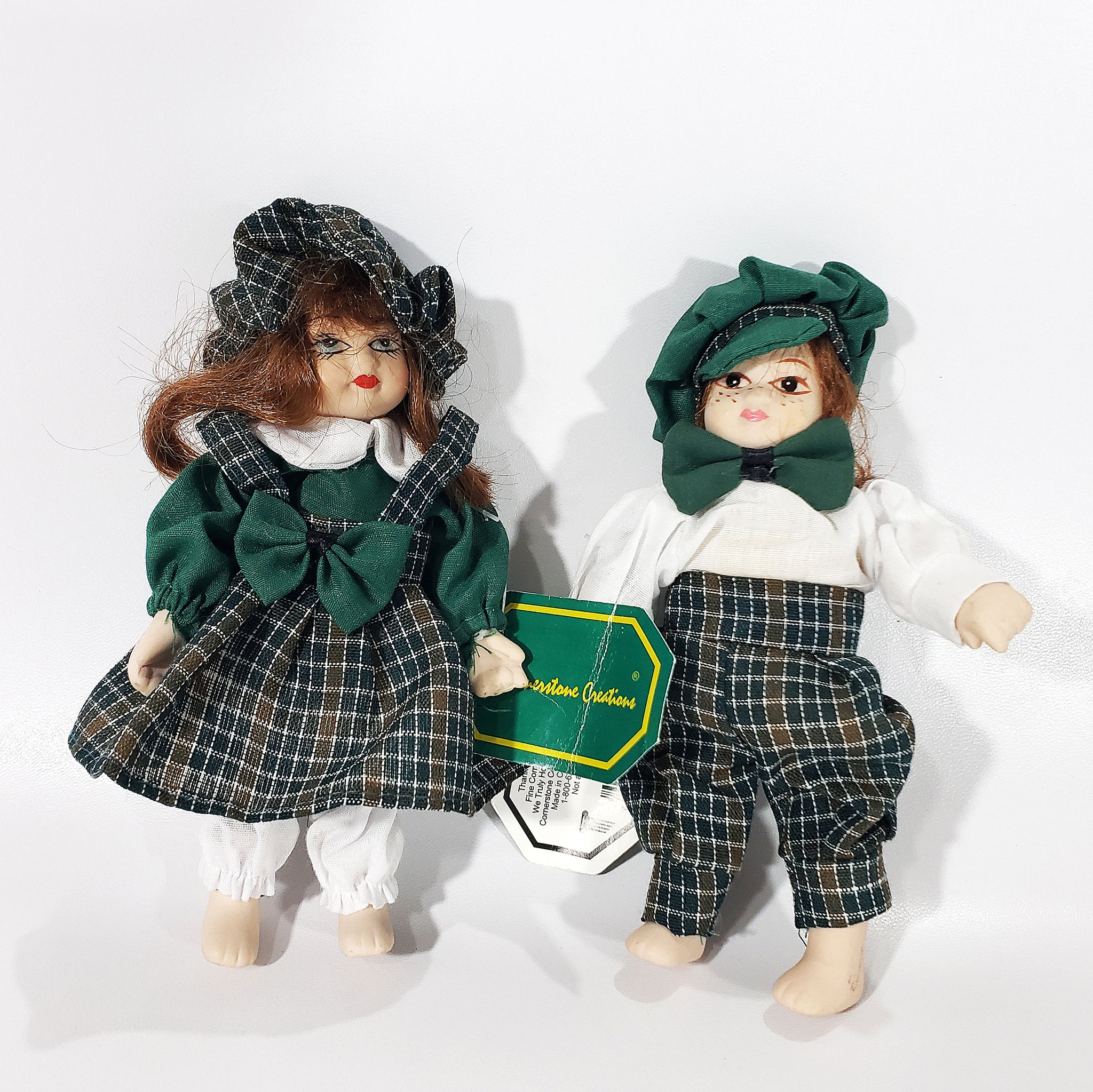 Juego de tres piezas de muñecos de porcelana y trapo. Dos de las piezas son pequeñas y las extremidades al interior son de alambrón, por lo cual se pueden modificar de posición, pueden colocarse con los pies extendidos, doblados, igual con los brazos.