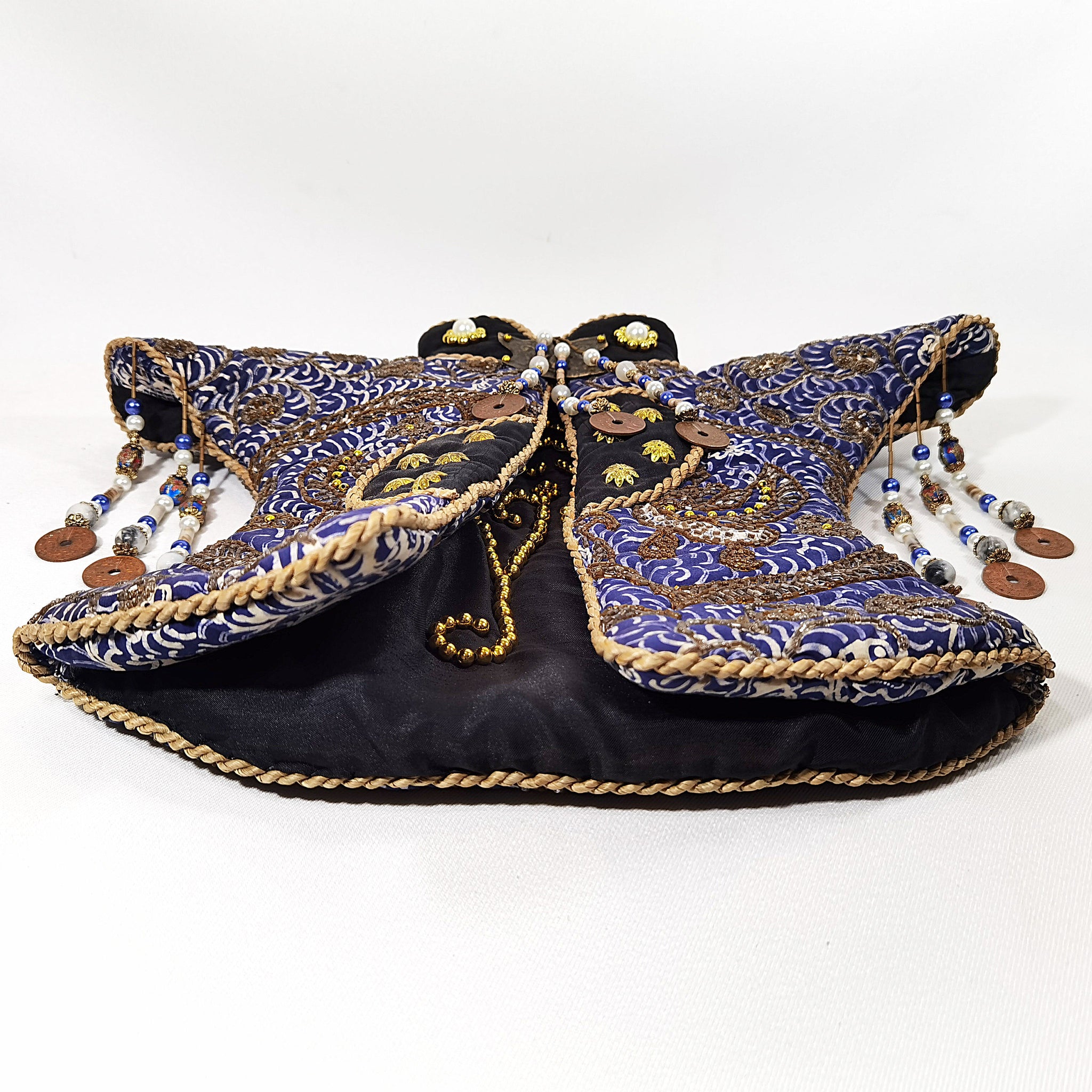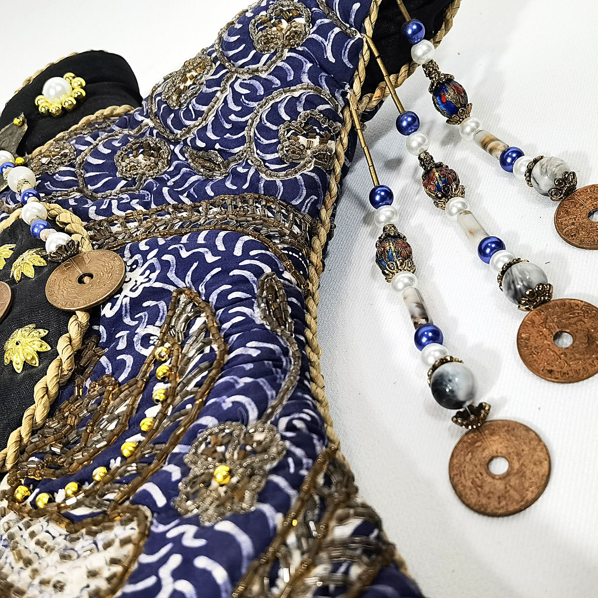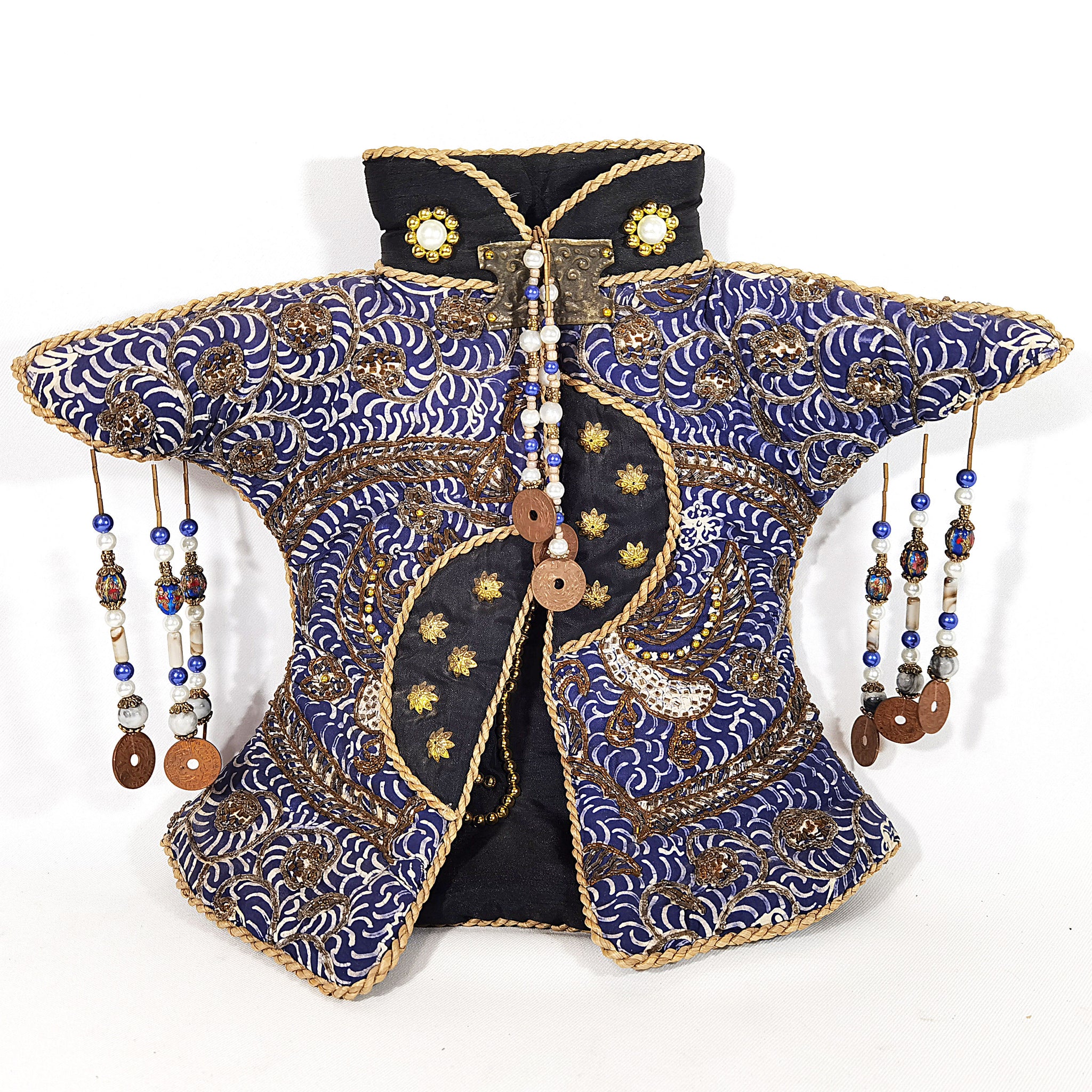 Fabulosa y muy poco común pieza decorativa hecha a mano en Indonesia. La pieza está hecha en la técnica de teñido llamada "Batik", sobre la cual se aplican complejos decorados, bordados y otros elementos decorativos de valor tales como cuentas de esmalte alveolado y monedas, que brindan a la pieza su magnífica apariencia.