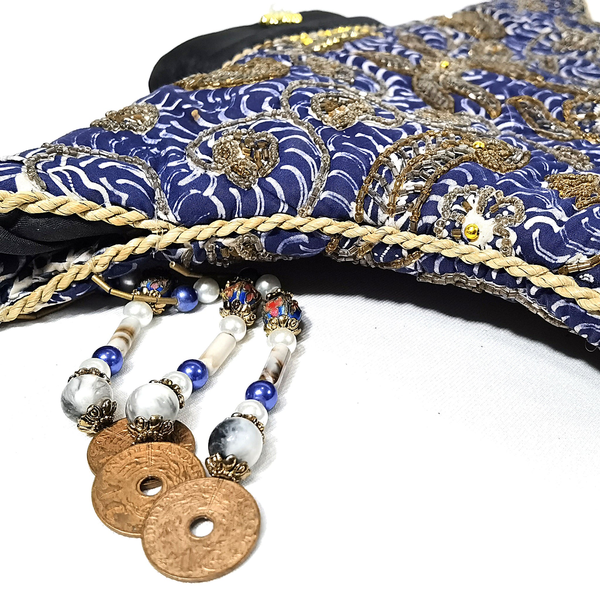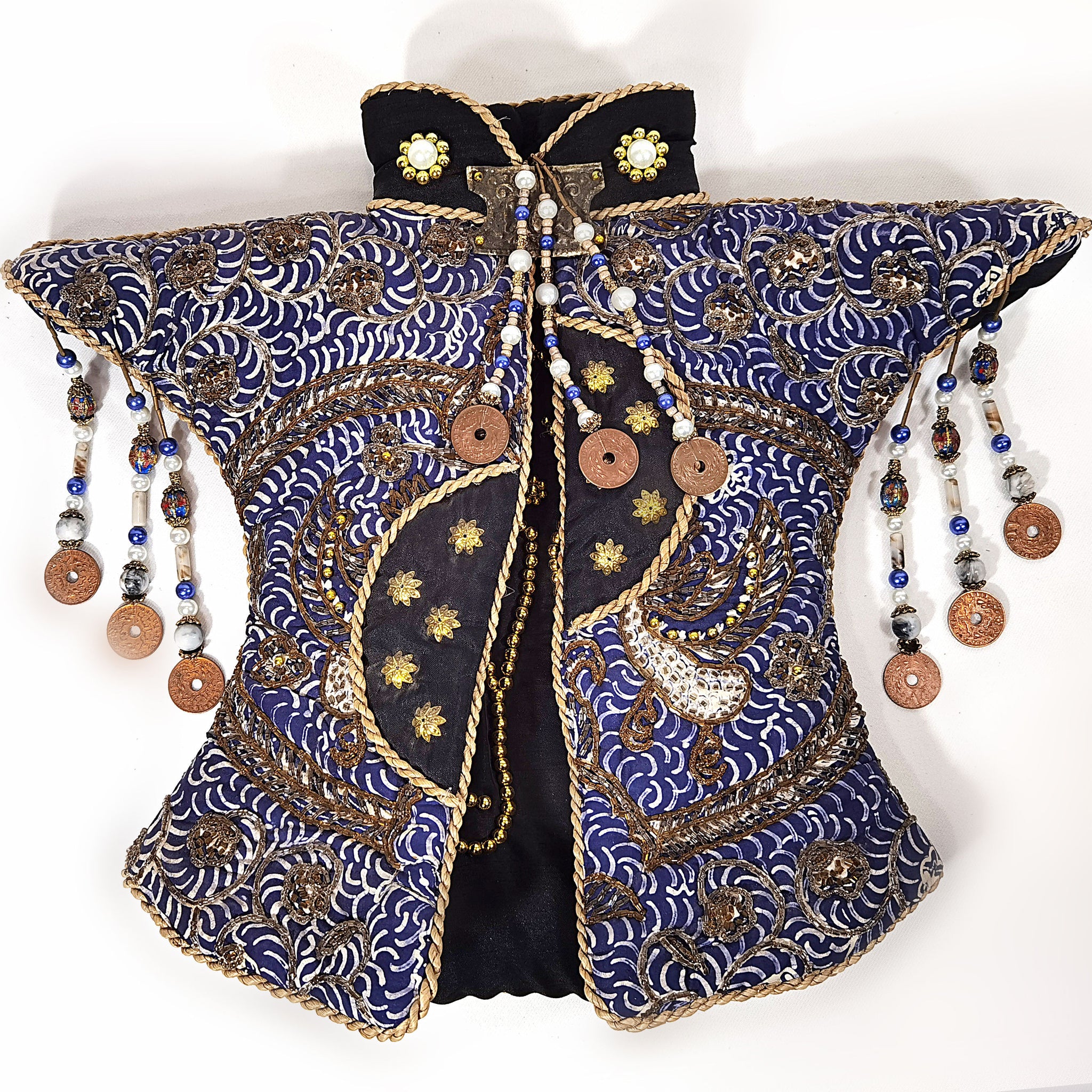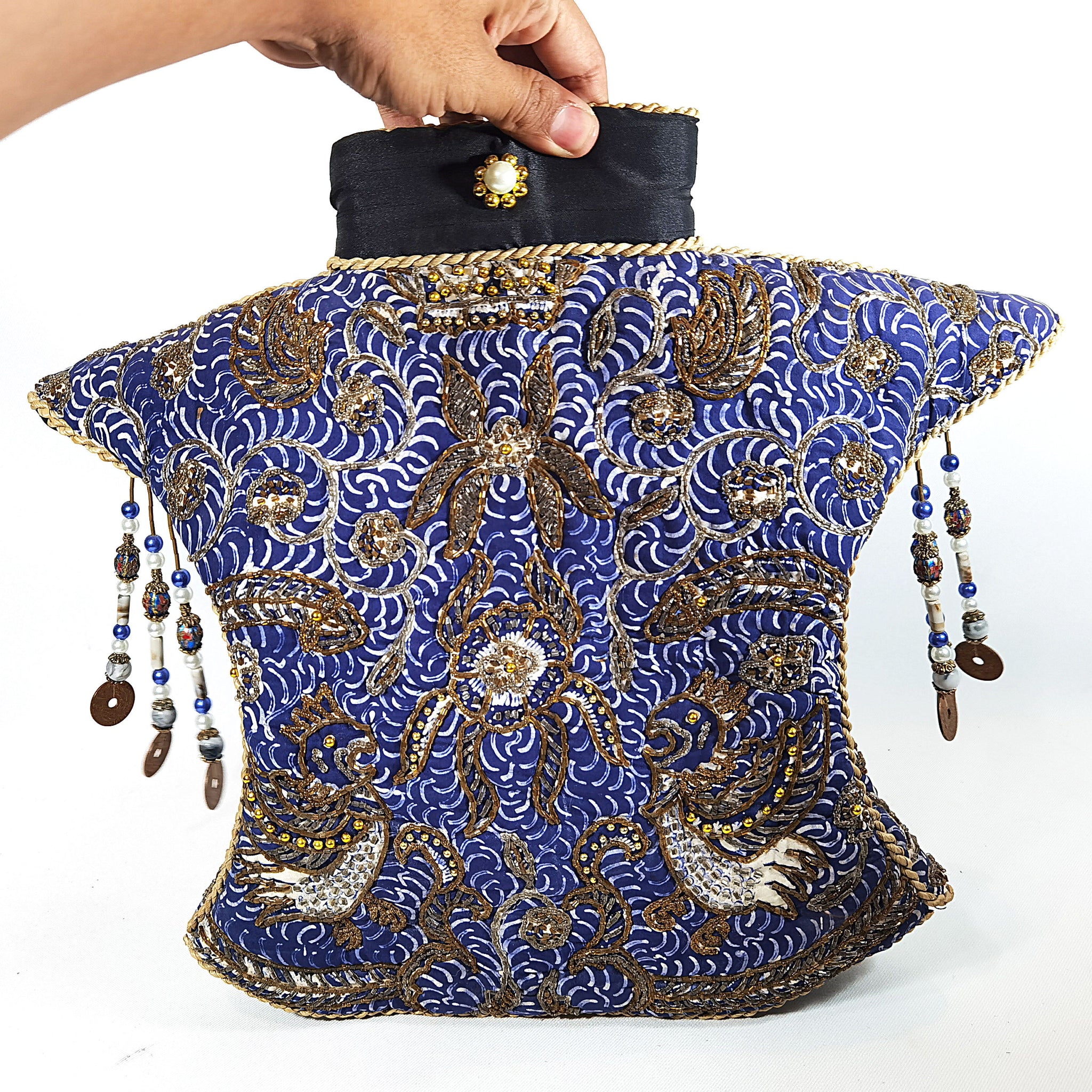 Fabulosa y muy poco común pieza decorativa hecha a mano en Indonesia. La pieza está hecha en la técnica de teñido llamada "Batik", sobre la cual se aplican complejos decorados, bordados y otros elementos decorativos de valor tales como cuentas de esmalte alveolado y monedas, que brindan a la pieza su magnífica apariencia.