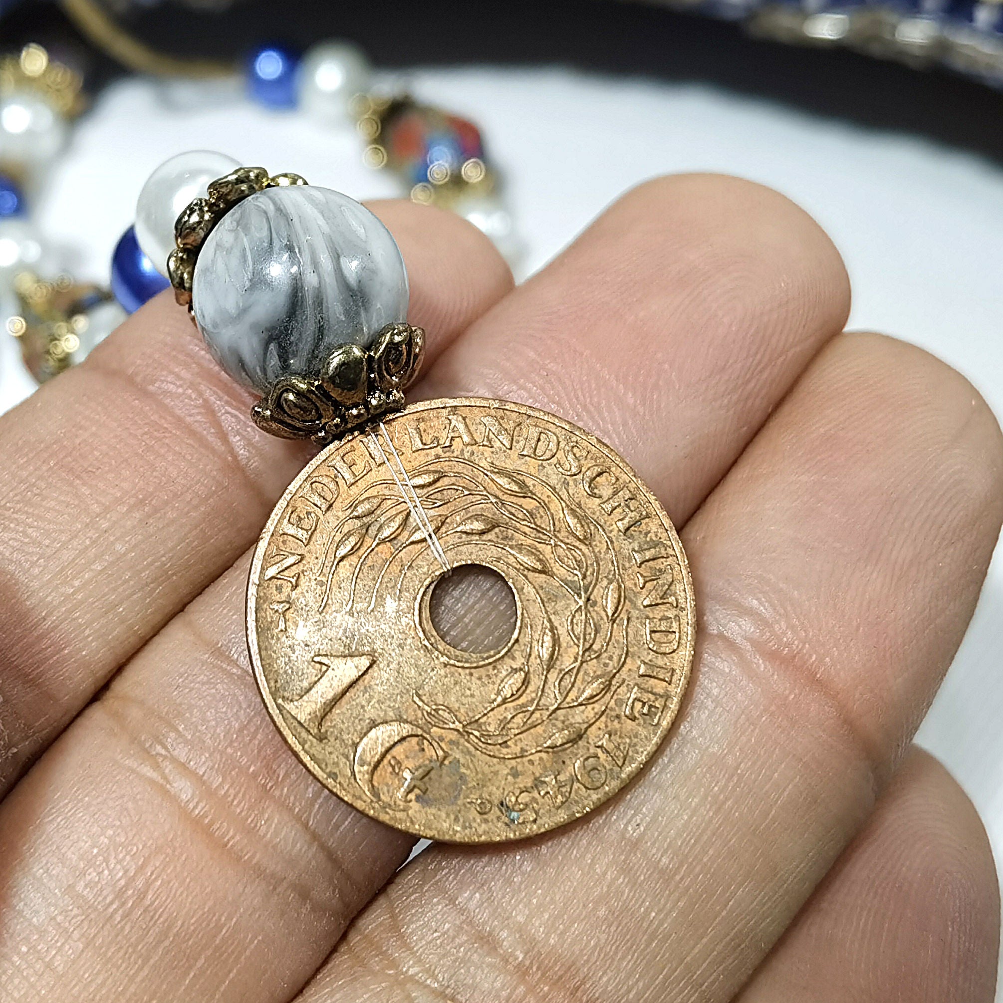 La pieza está diseñada para ser colocada en una especie de travesaño que va de manga a manga. La pieza que tenemos es única, las monedas que tiene como decoración son monedas de 1 centavo de 1945 de las desaparecias Indias Orientales Neerlandesas.