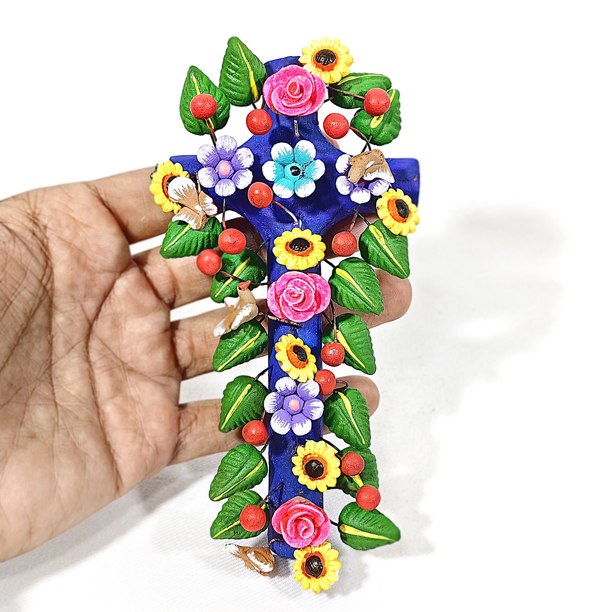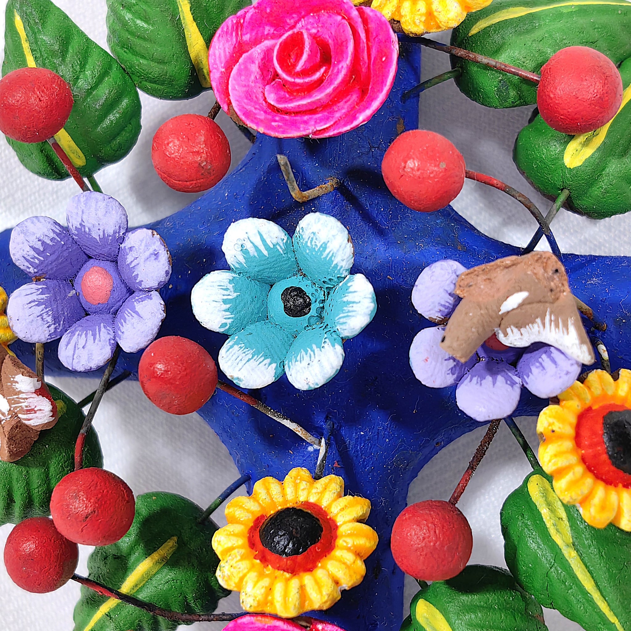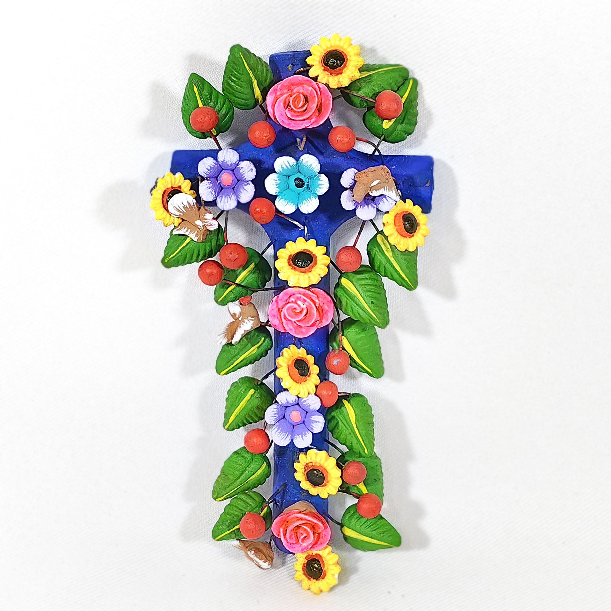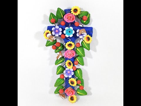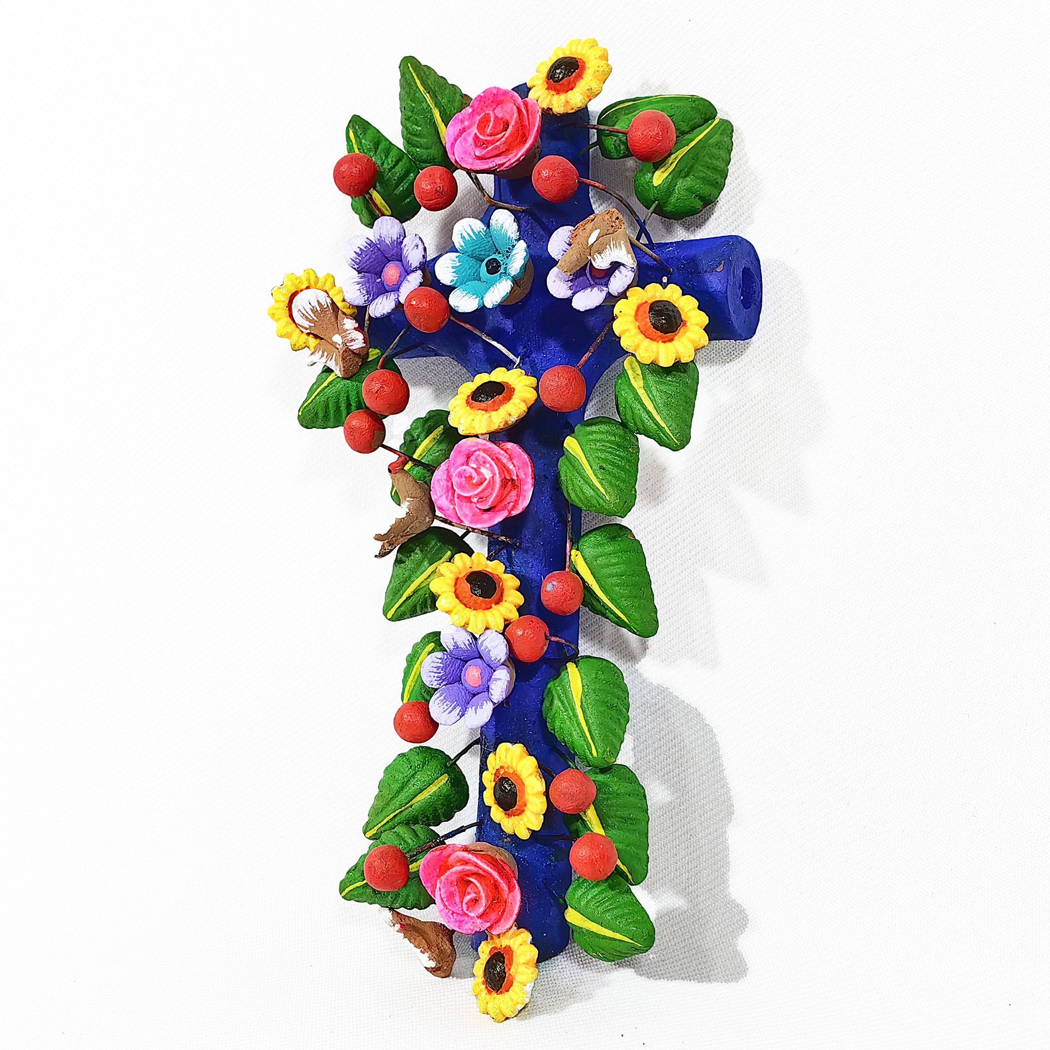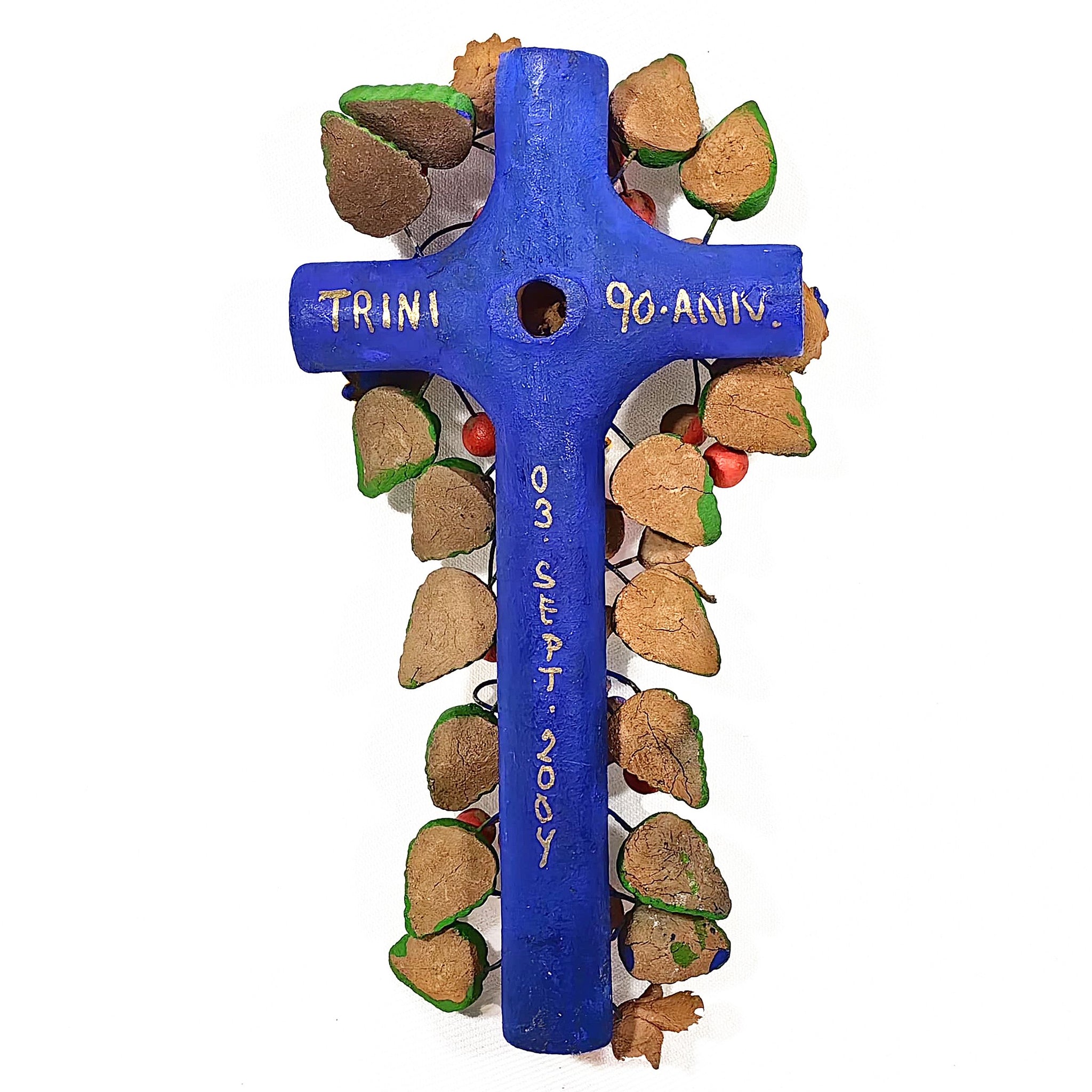 Preciosa y colorida cruz artesanal realizada en barro con decoración de flores y aves. La pieza que nos llegó fue un presente regalado con fecha registrada en el reverso del 3 de septiembre de 2004.