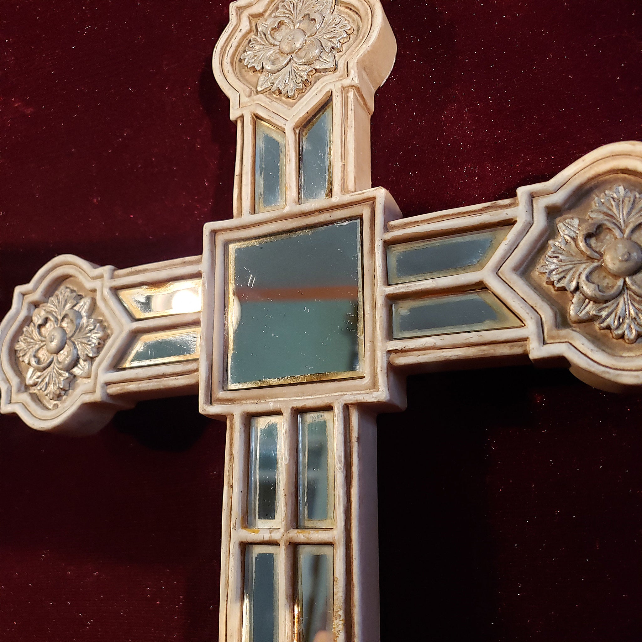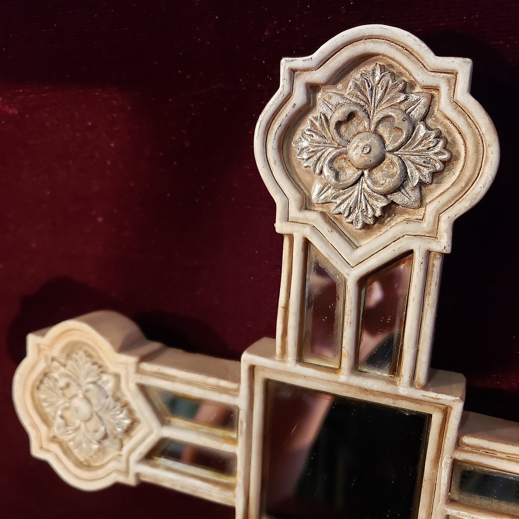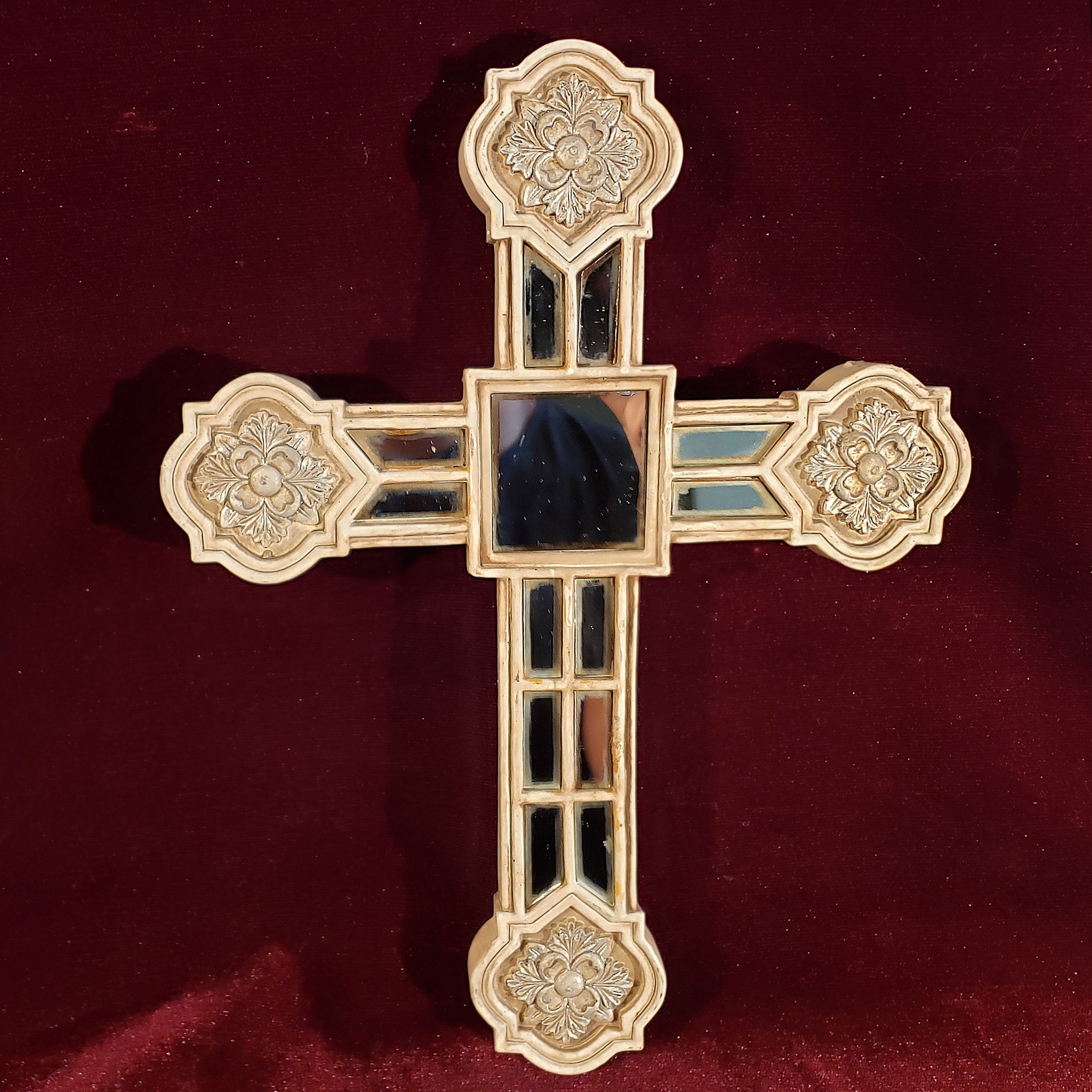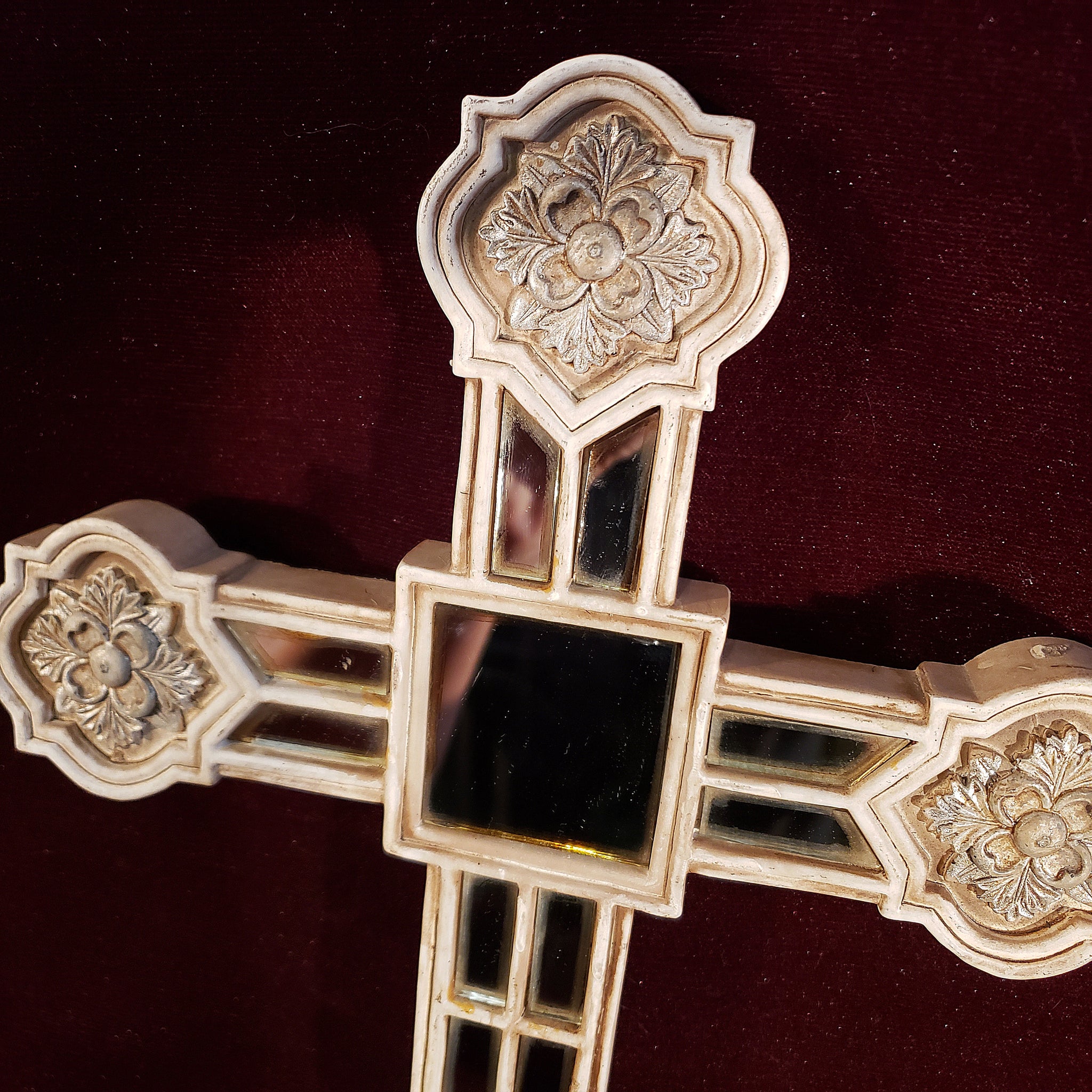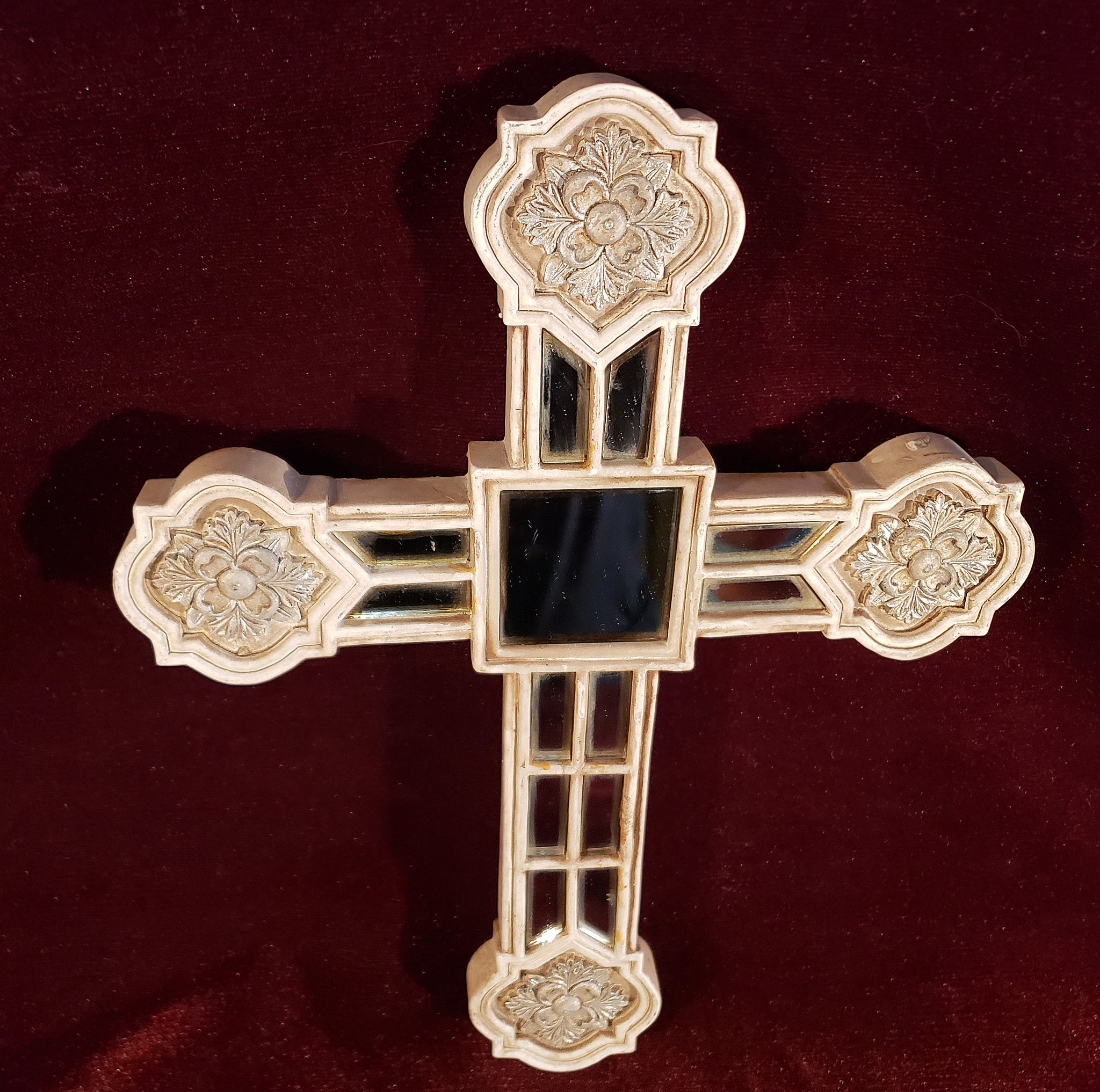 Hermosa cruz con aspecto envejecido dado por el paso de los años. La particularidad de esta pieza son las secciones de espejo que también presentan ese magnífico aspecto envejecido obtenido de manera natural.