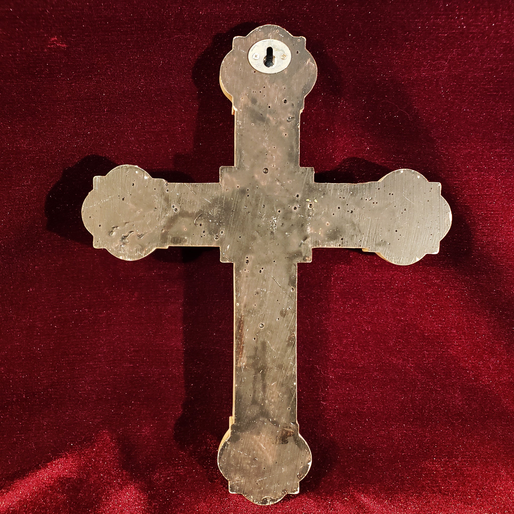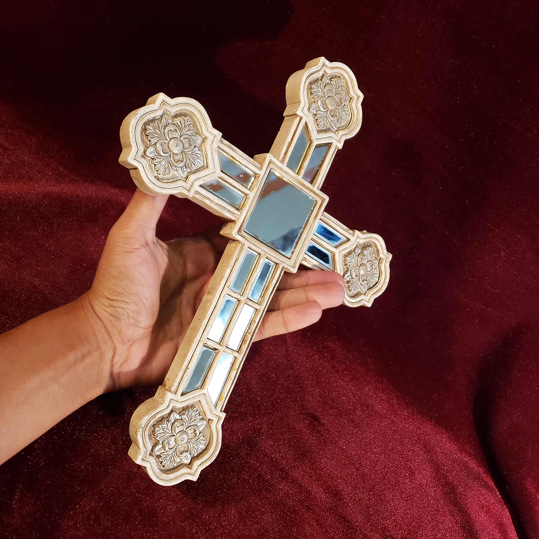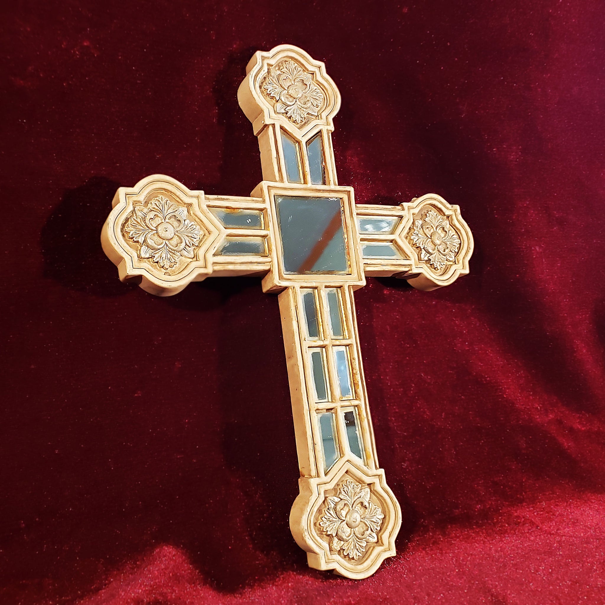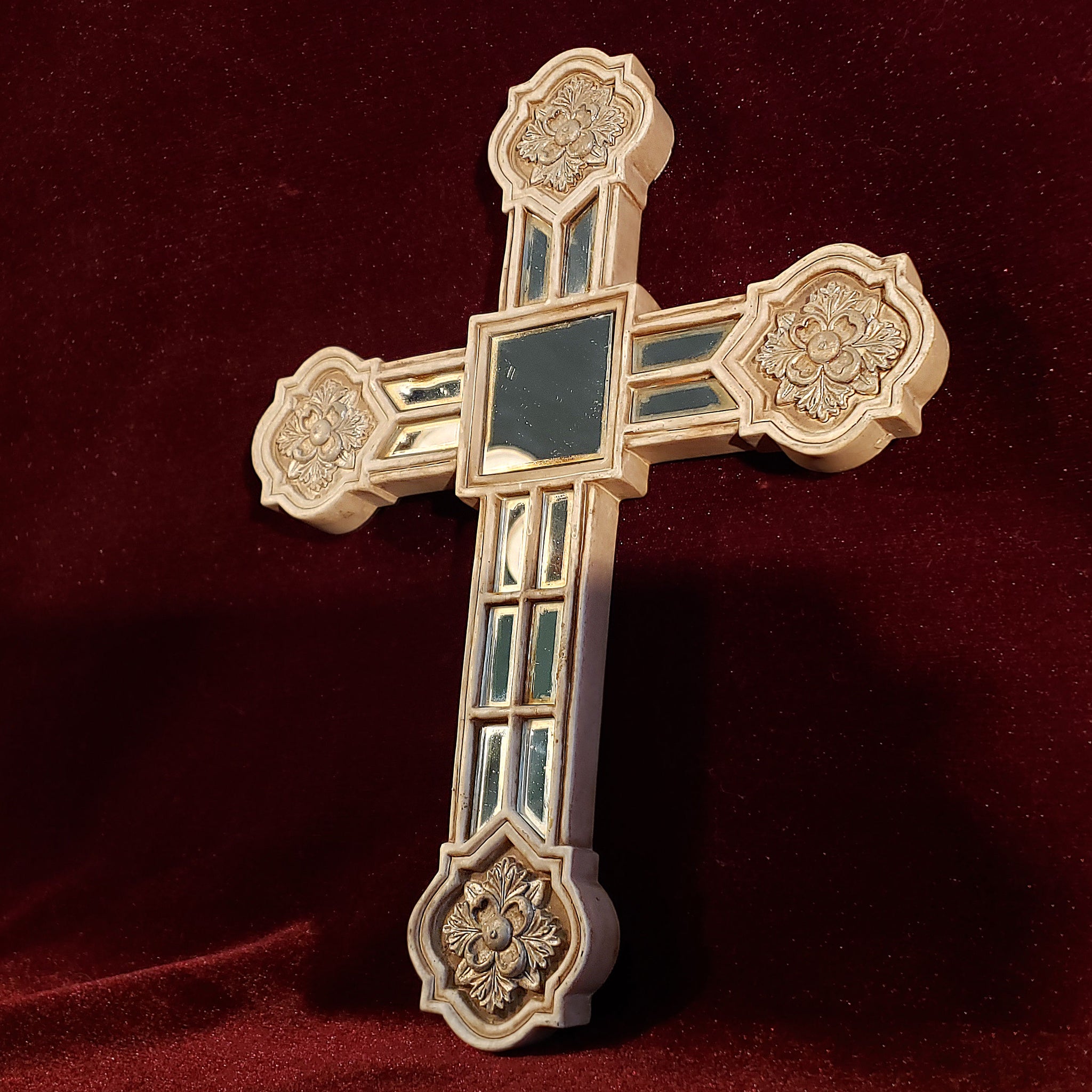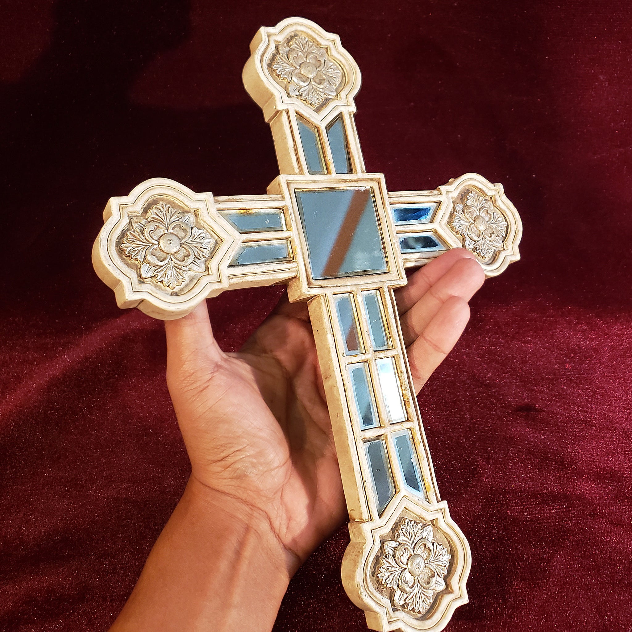 Hermosa cruz con aspecto envejecido dado por el paso de los años. La particularidad de esta pieza son las secciones de espejo que también presentan ese magnífico aspecto envejecido obtenido de manera natural.