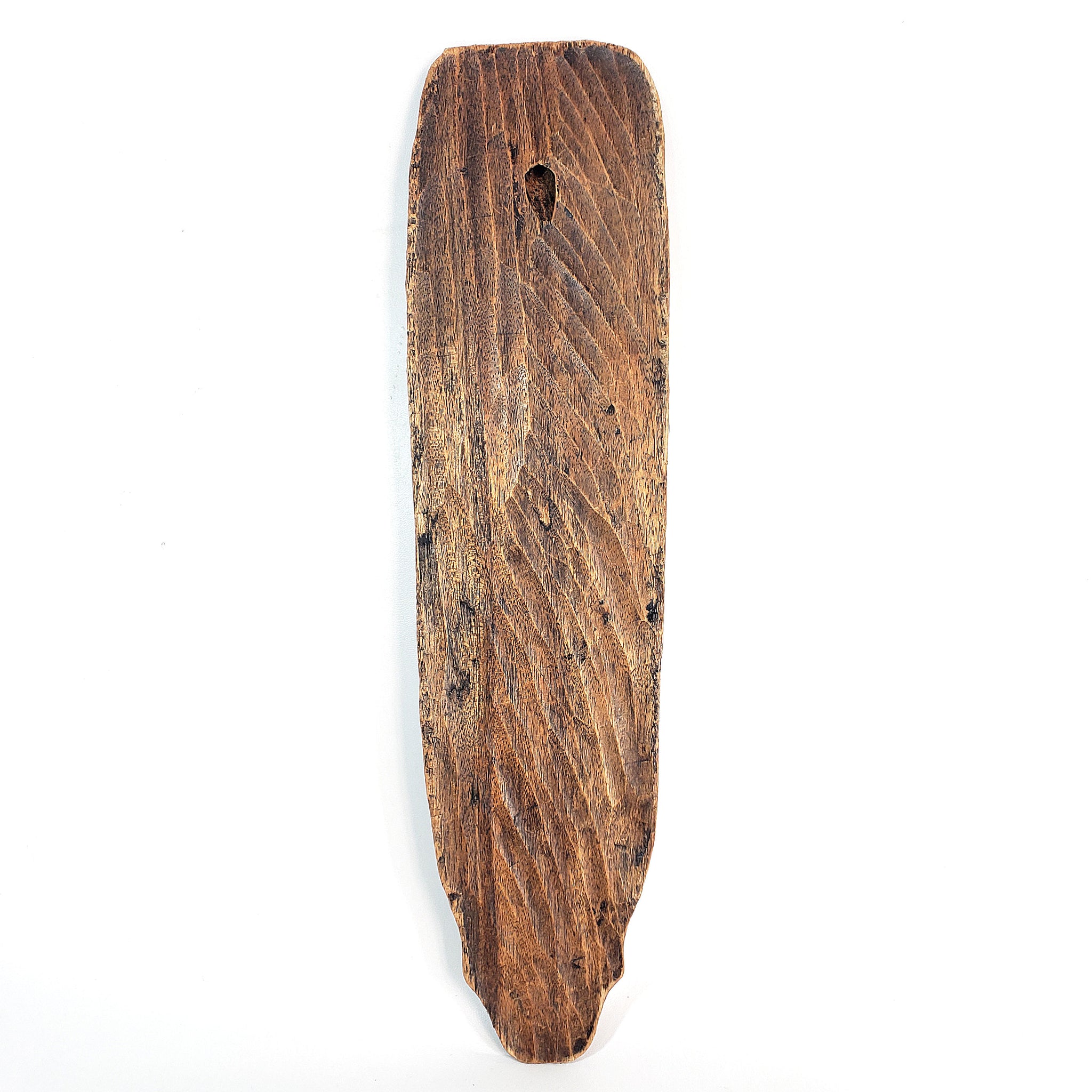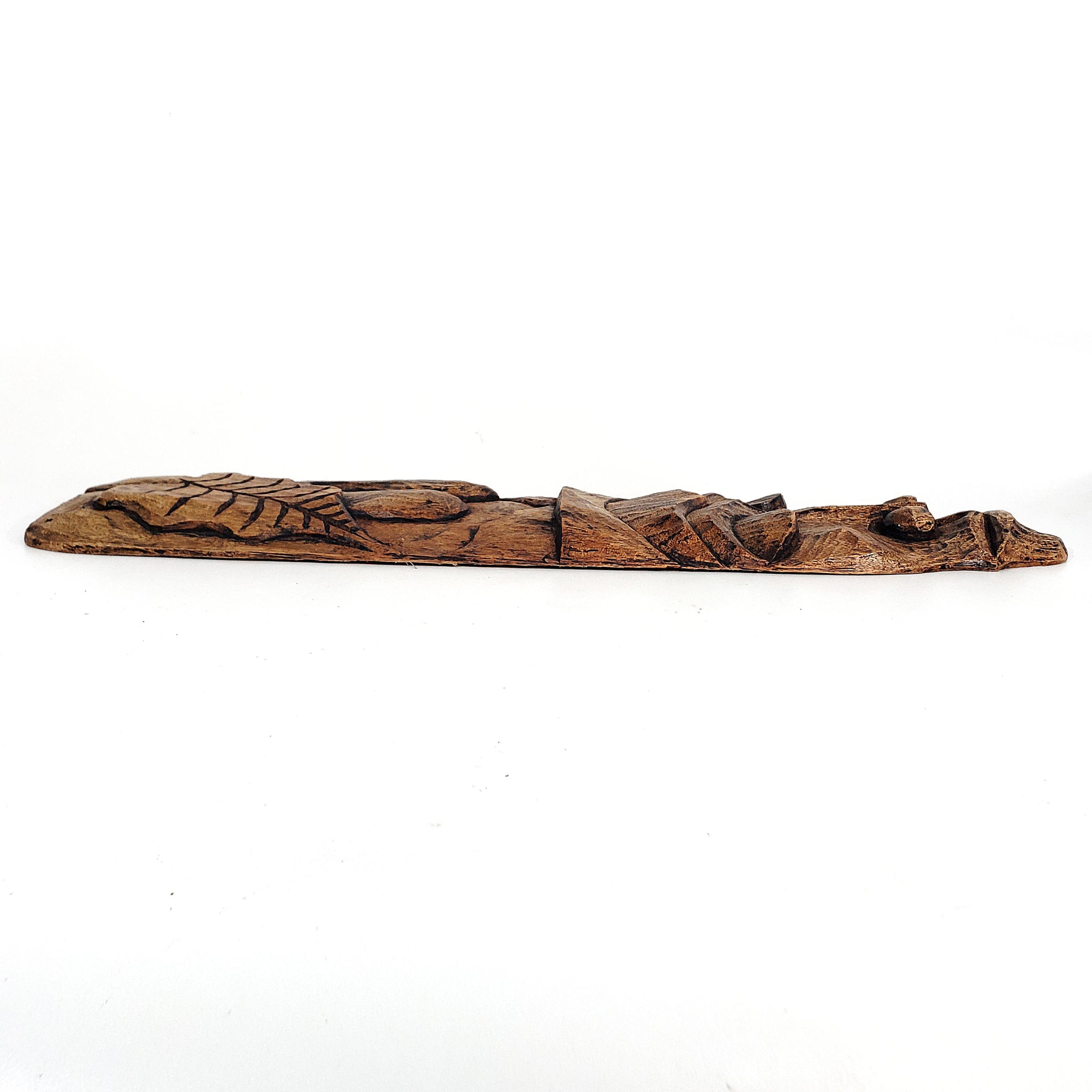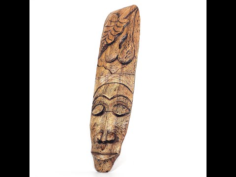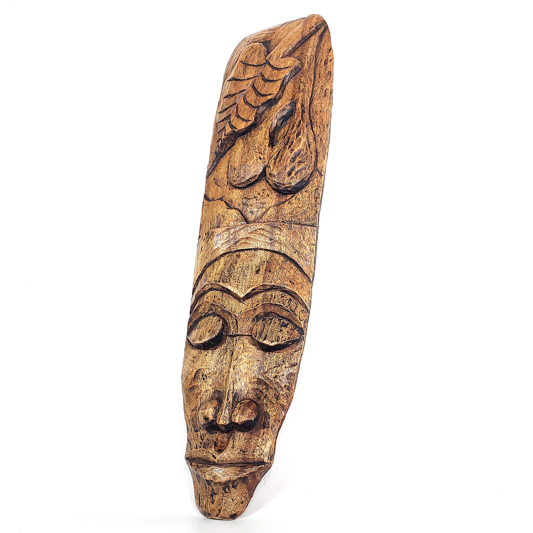 Interesante pieza tallada a mano en madera, estilo tribal. Se encuentra en perfectas condiciones, sin ninguna quebradura ni astilladura. En la parte posterior tiene un hendidura para ser colocada idealmente sobre un clavo en pared.