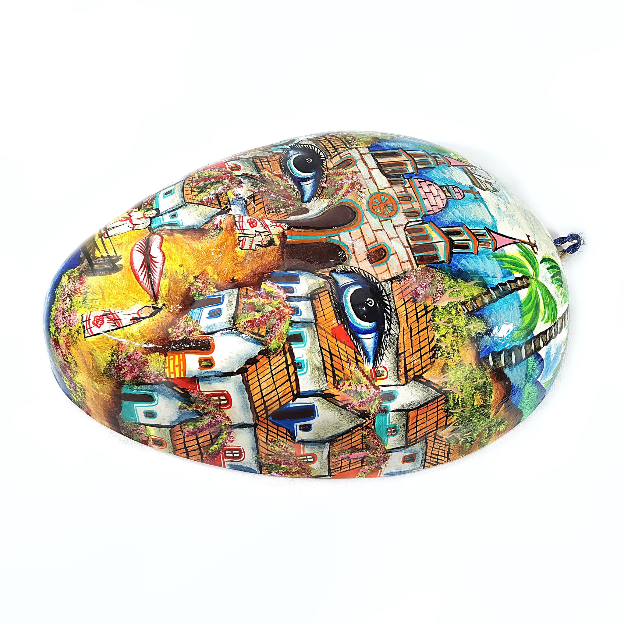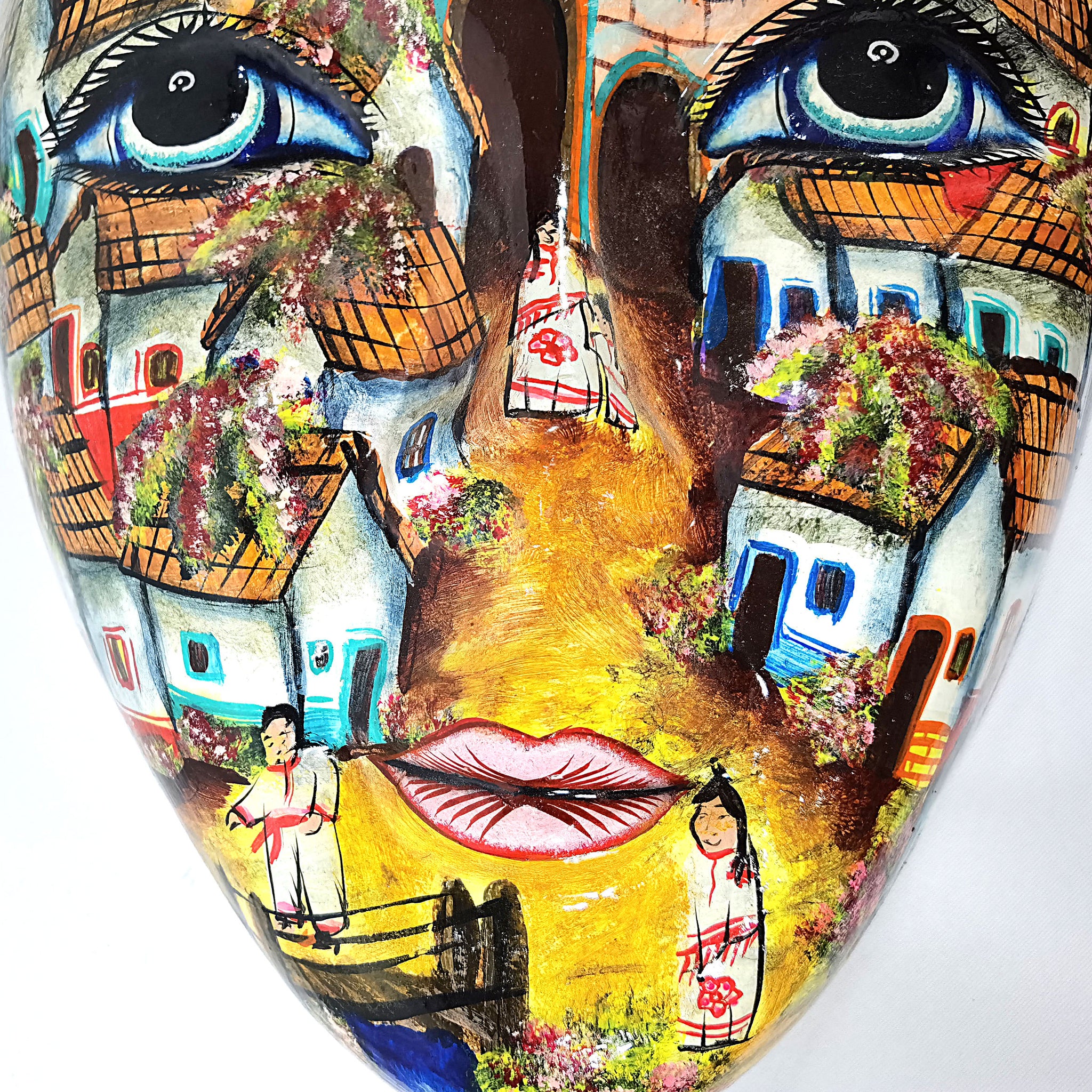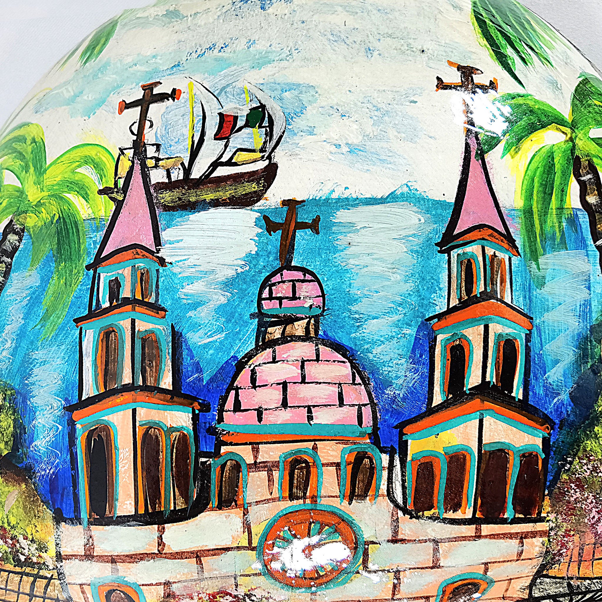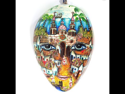 Imponente pieza artesanal de 54 cm de altura, para pared, pintada a mano, con escenas de paisajes mexicanos. La pieza tiene la particularidad adicional de estar hecha en fibra de vidrio, lo cual le hace una pieza ligera, pero altamente resistente.