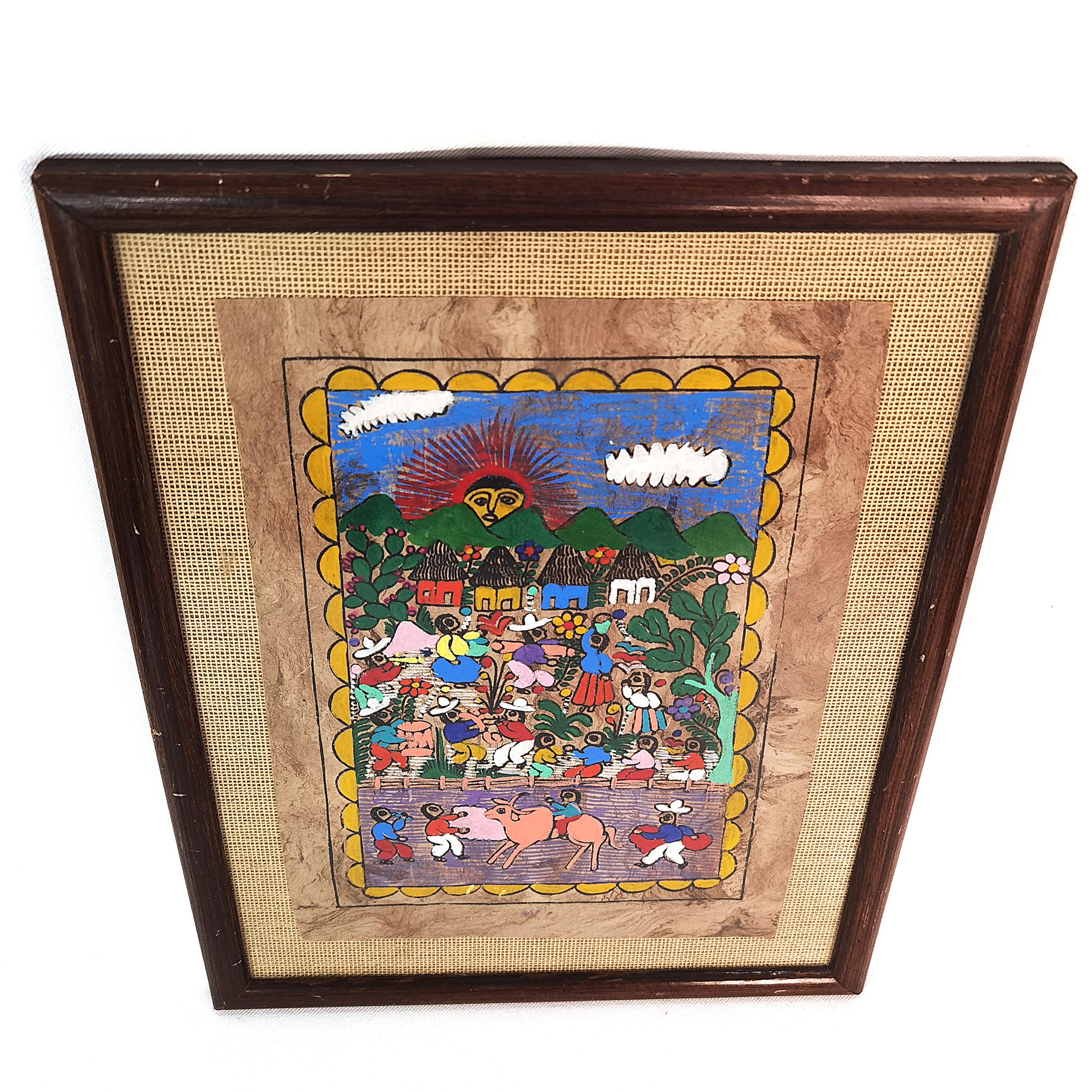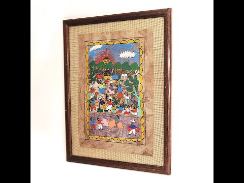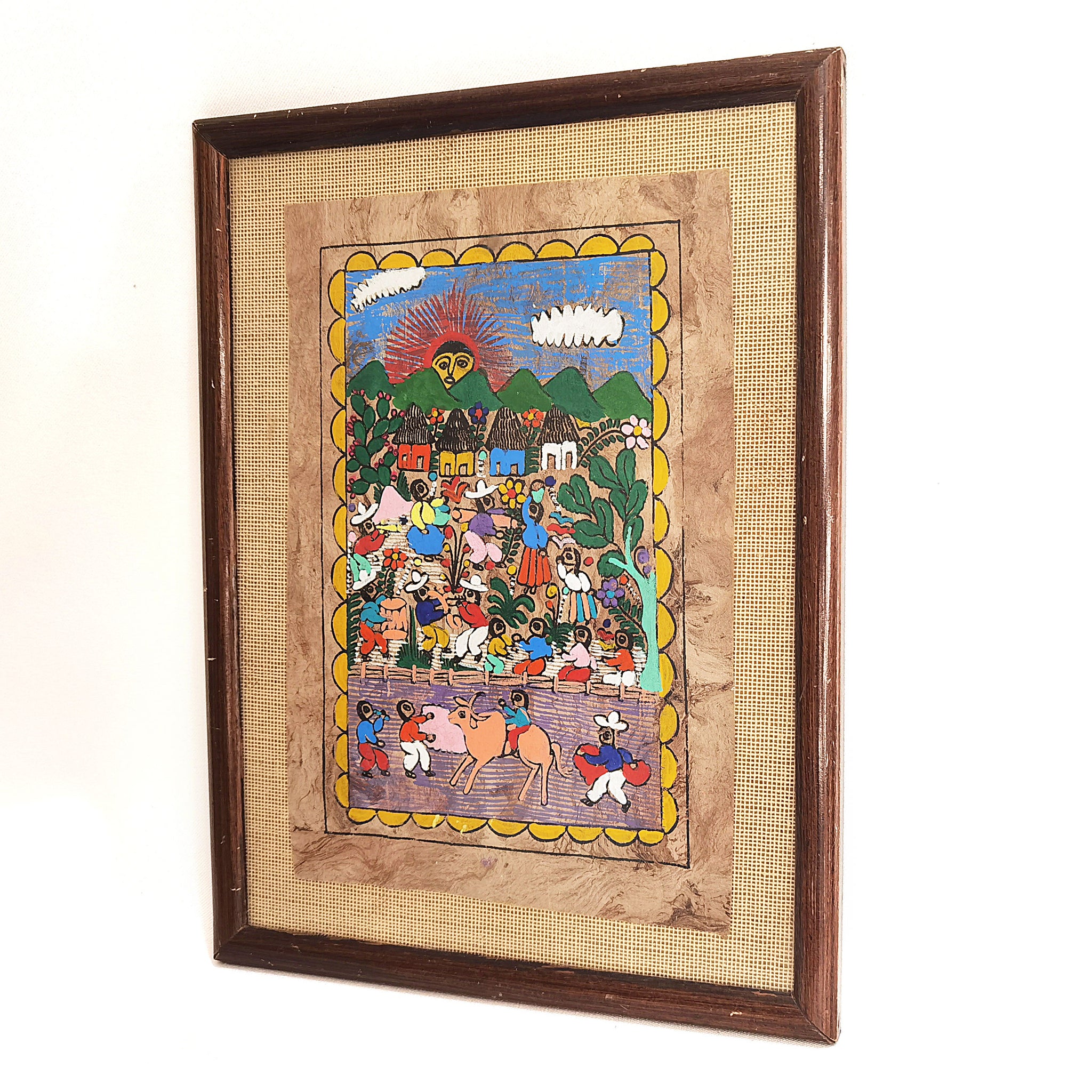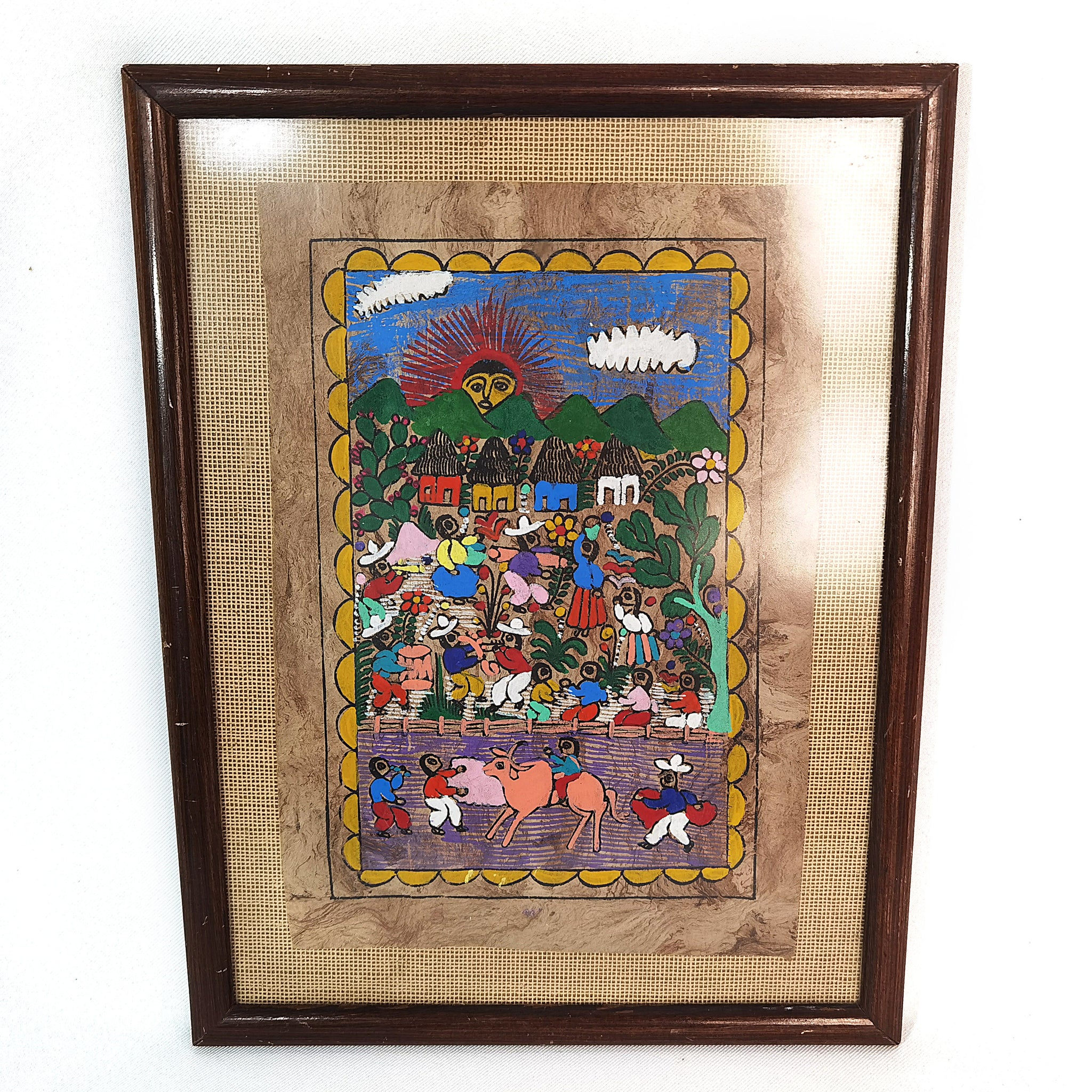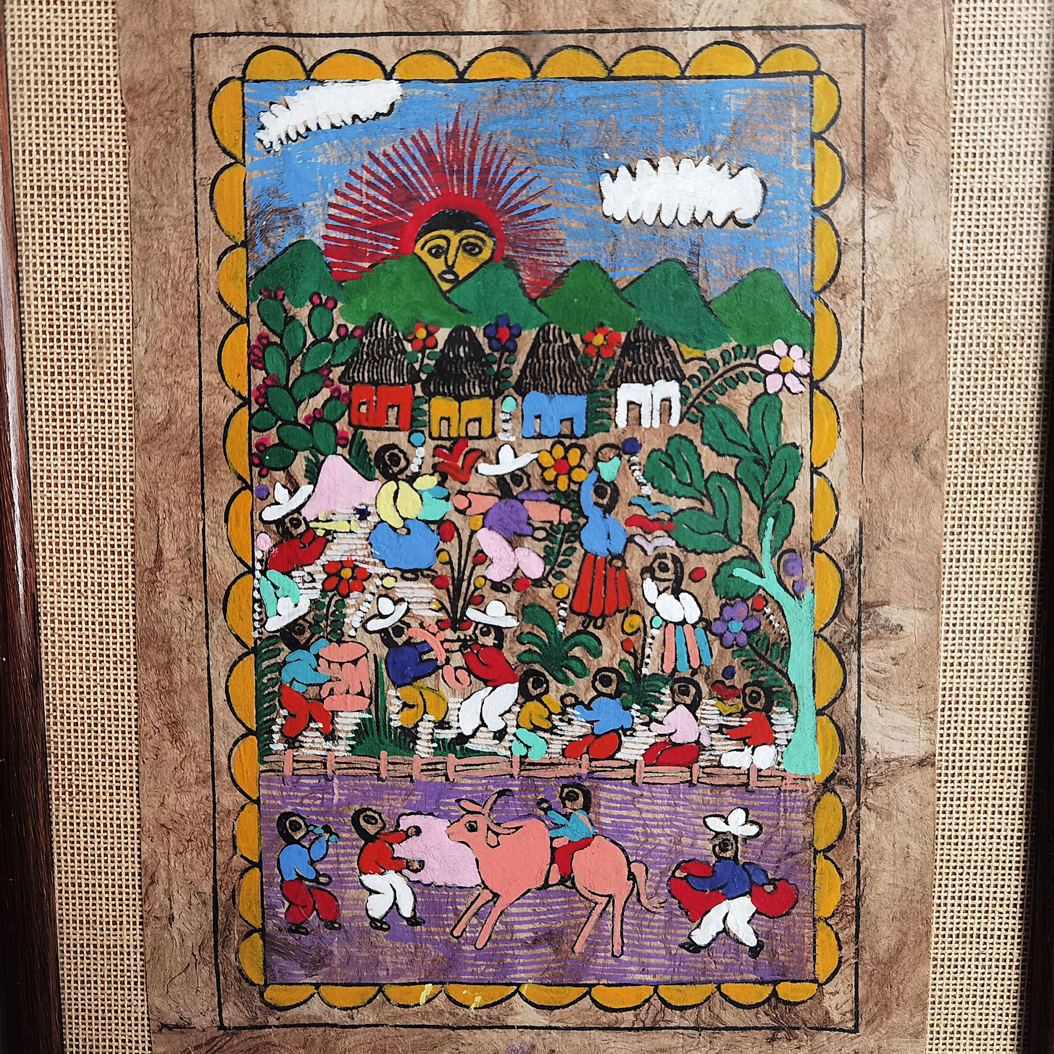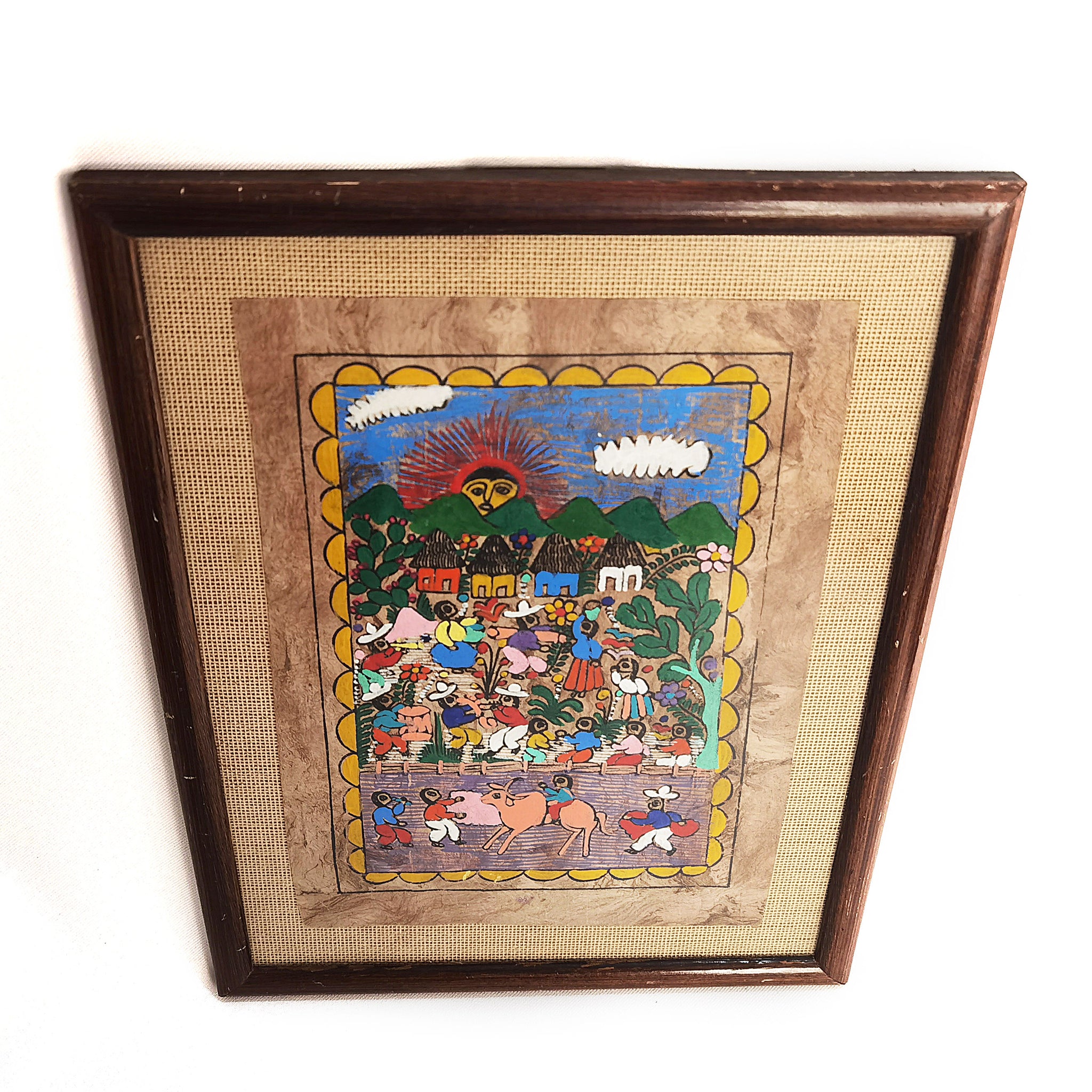 Preciosa pintura realizada de manera artesanal en papel amate, con la representación de una escena campirana. Enmarcada en madera con cristal antireflejante.