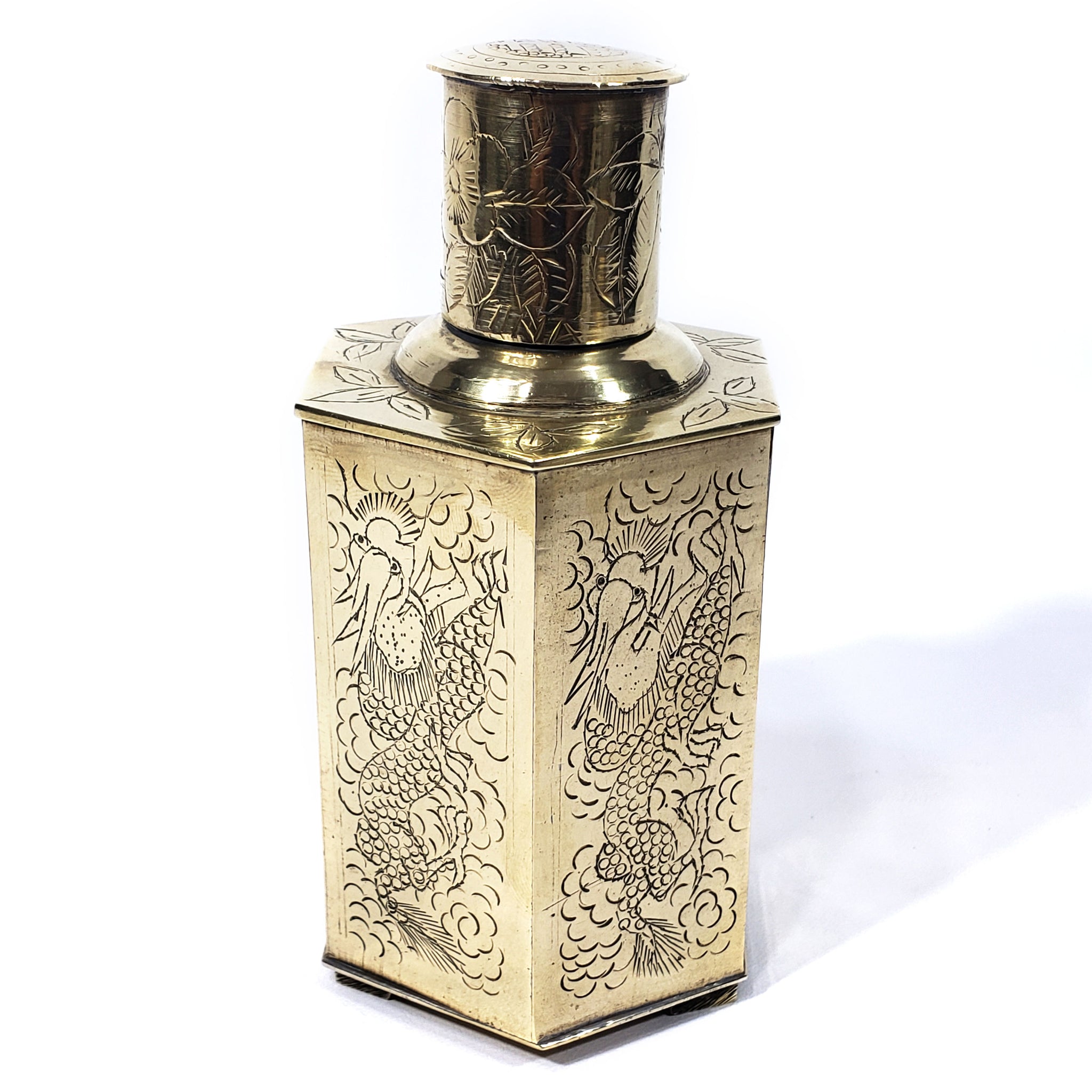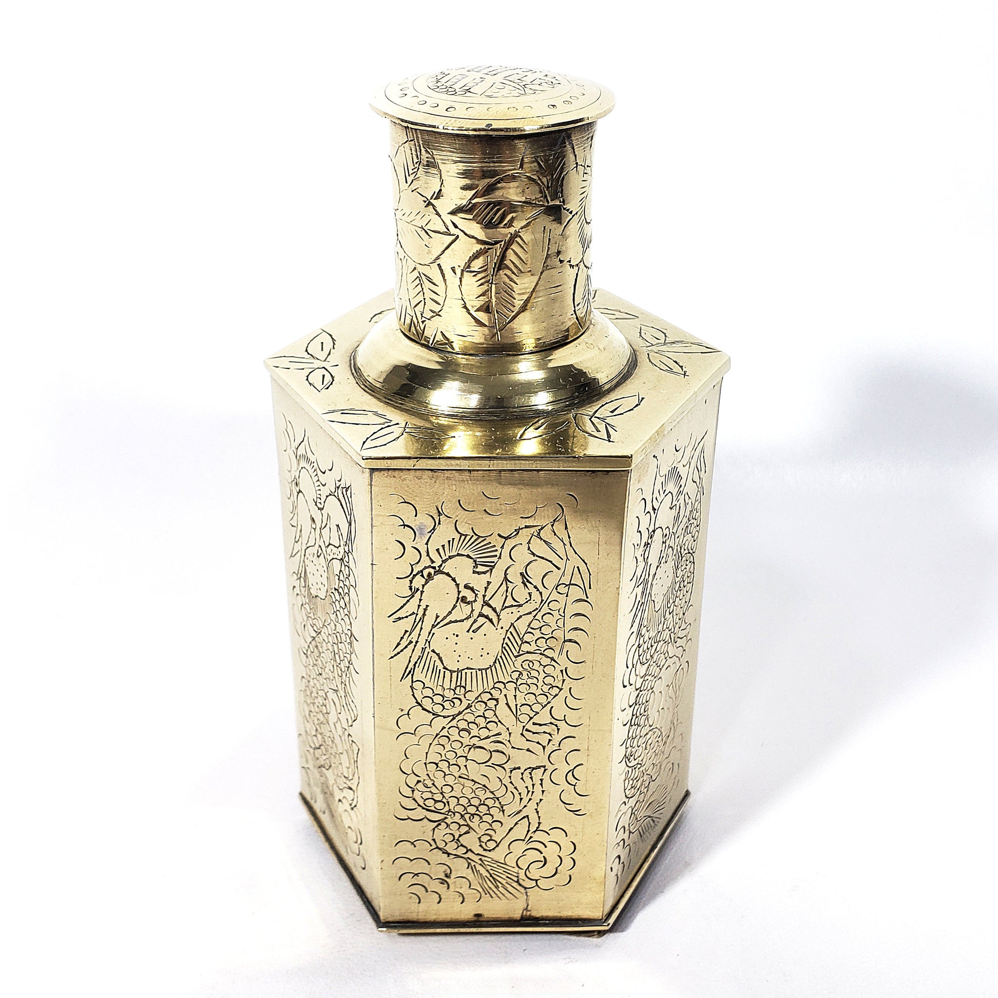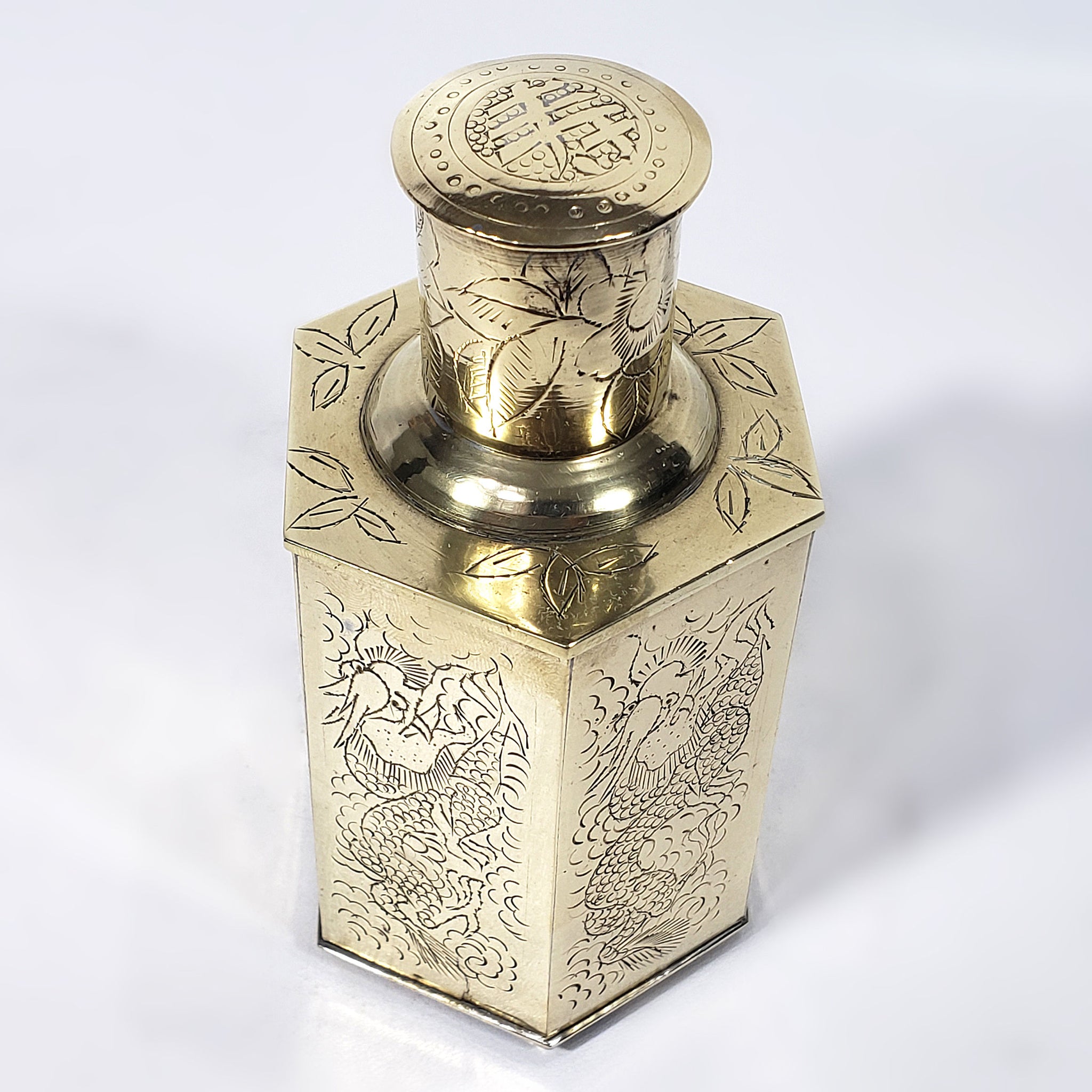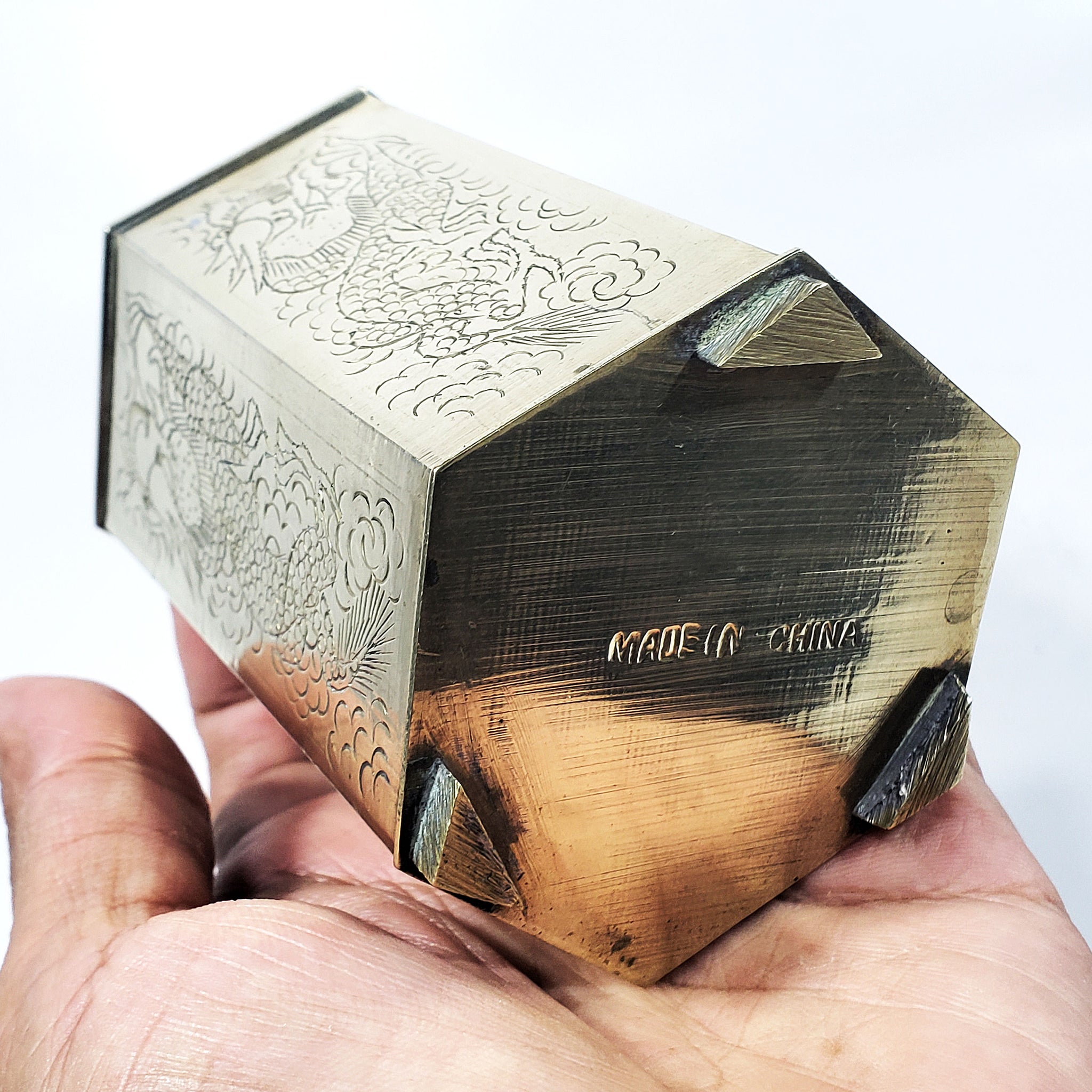 Hermosa pieza, muy poco común. Realizada para almacenar té en su forma más tradicional. La elegante pieza realizada en bronce nos presenta decoración grabada de dragones en cada uno de sus 6 lados y decoración de hojas en la parte superior.