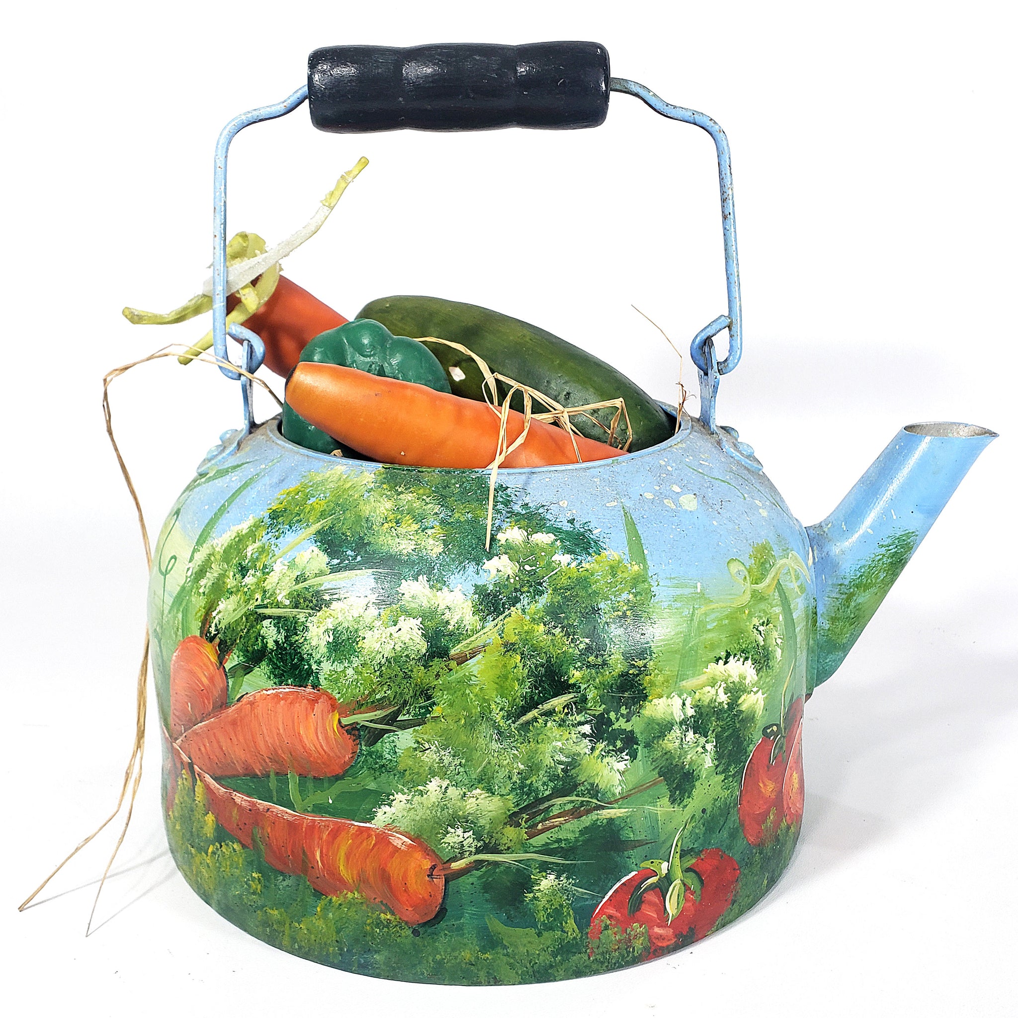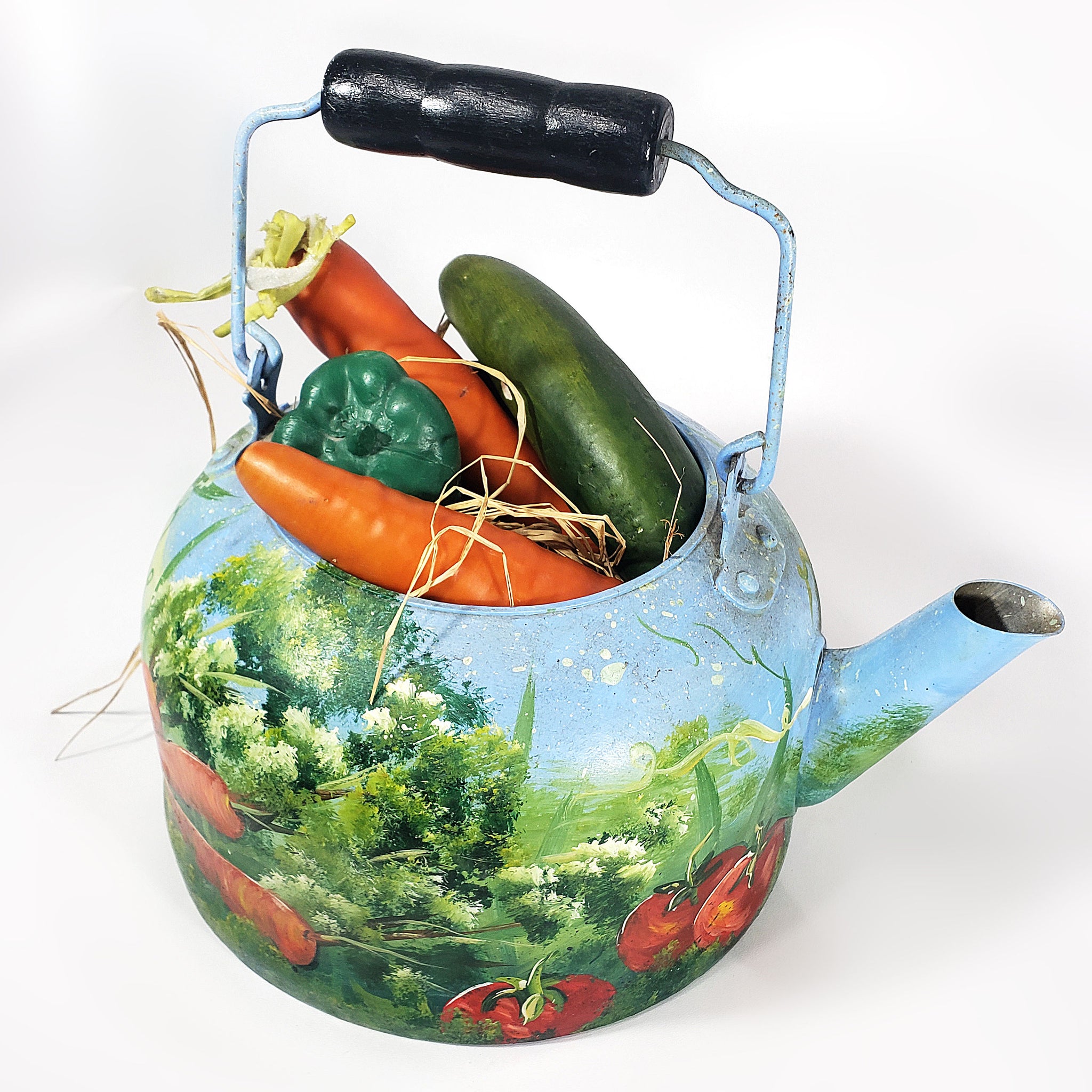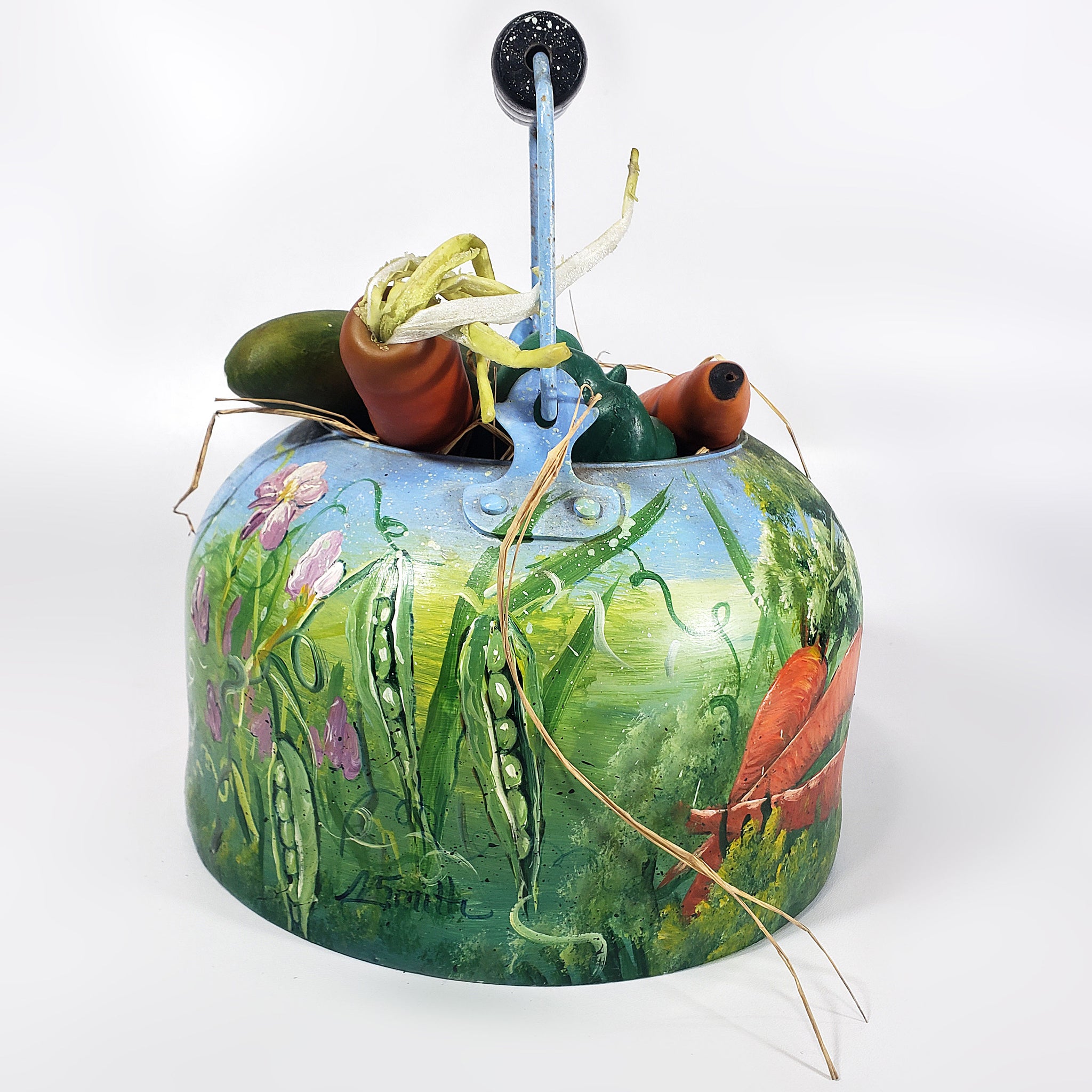 Peculiar pieza con antigüedad aproximada de 40 años, decorada con pintura al óleo firmada por A. Smith. La pieza, realizada en metal, nos presenta una peculiar decoración con calabazas, chícharos en vaina, flores, zanahorias y tomates.