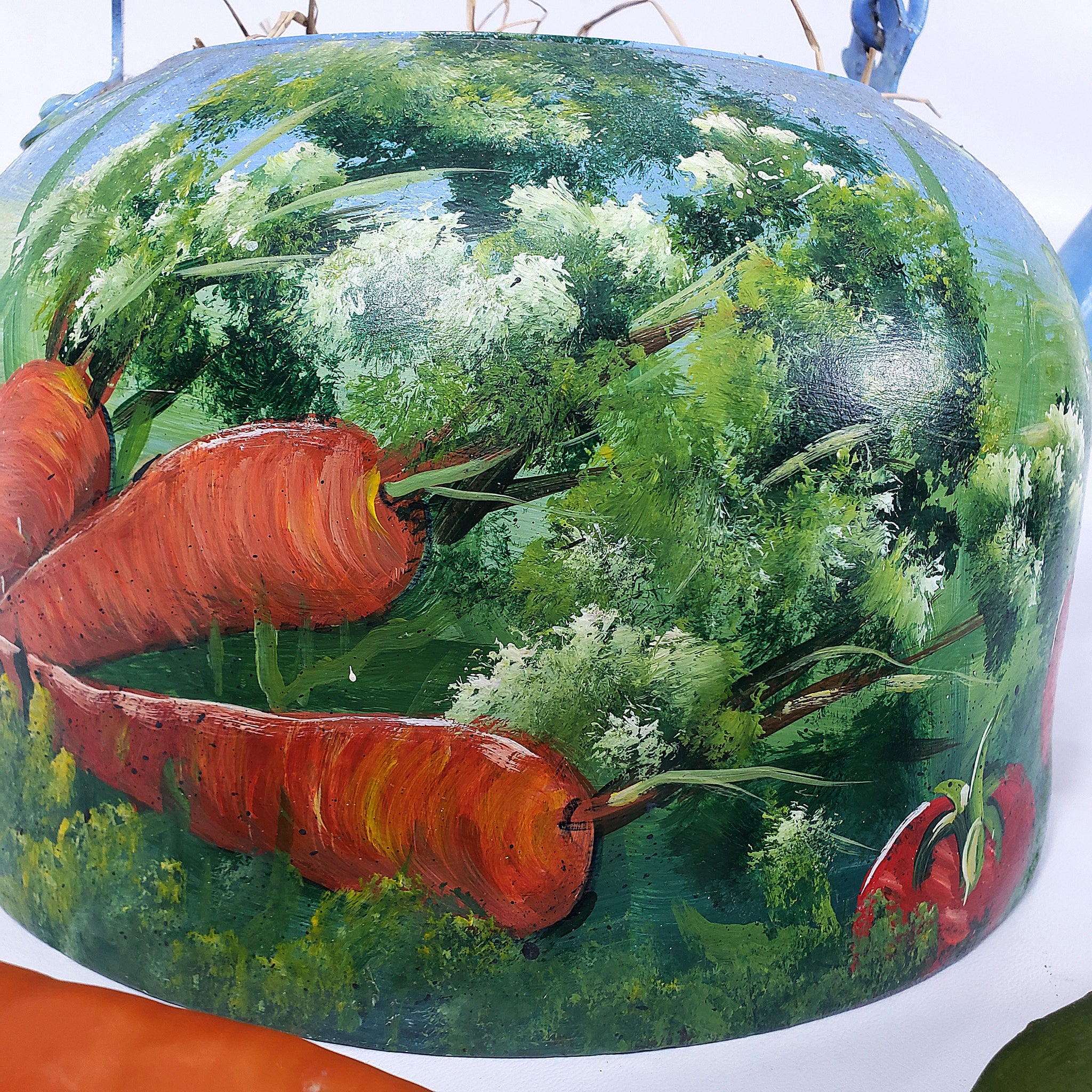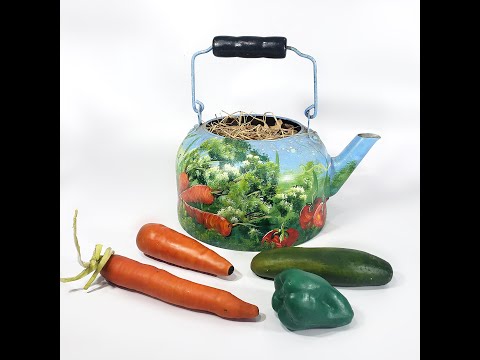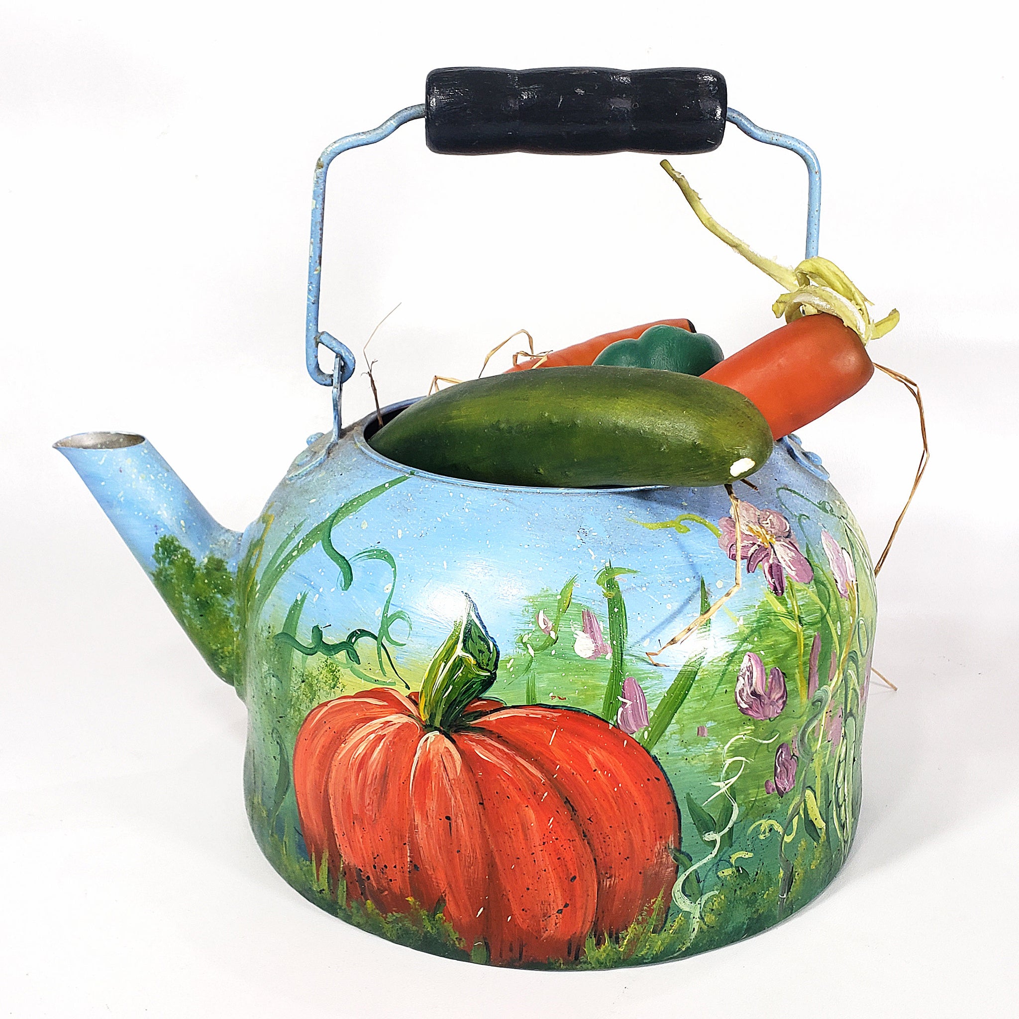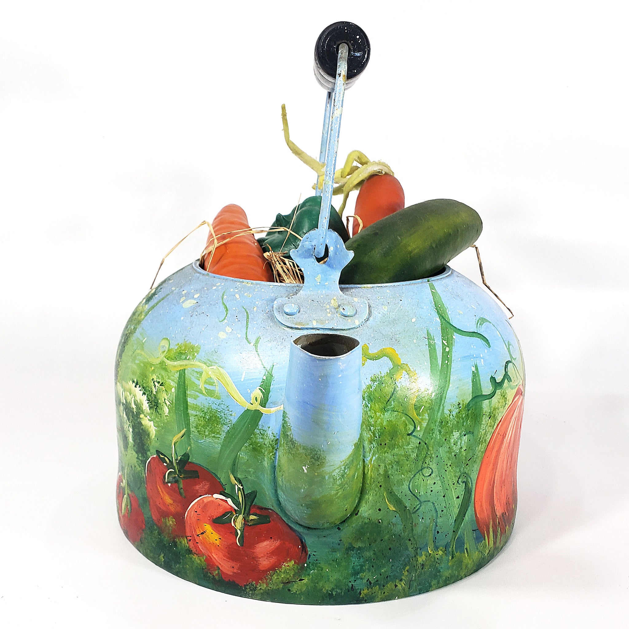 Peculiar pieza con antigüedad aproximada de 40 años, decorada con pintura al óleo firmada por A. Smith. La pieza, realizada en metal, nos presenta una peculiar decoración con calabazas, chícharos en vaina, flores, zanahorias y tomates.